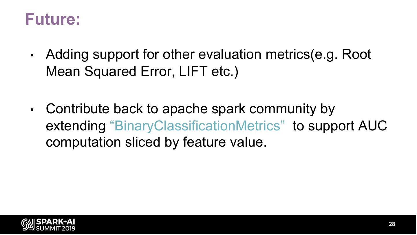 28 .Future: • Adding support for other evaluation metrics(e.g. Root Mean Squared Error, LIFT etc.) • Contribute back to apache spark community by extending “BinaryClassificationMetrics” to support AUC computation sliced by feature value. 28