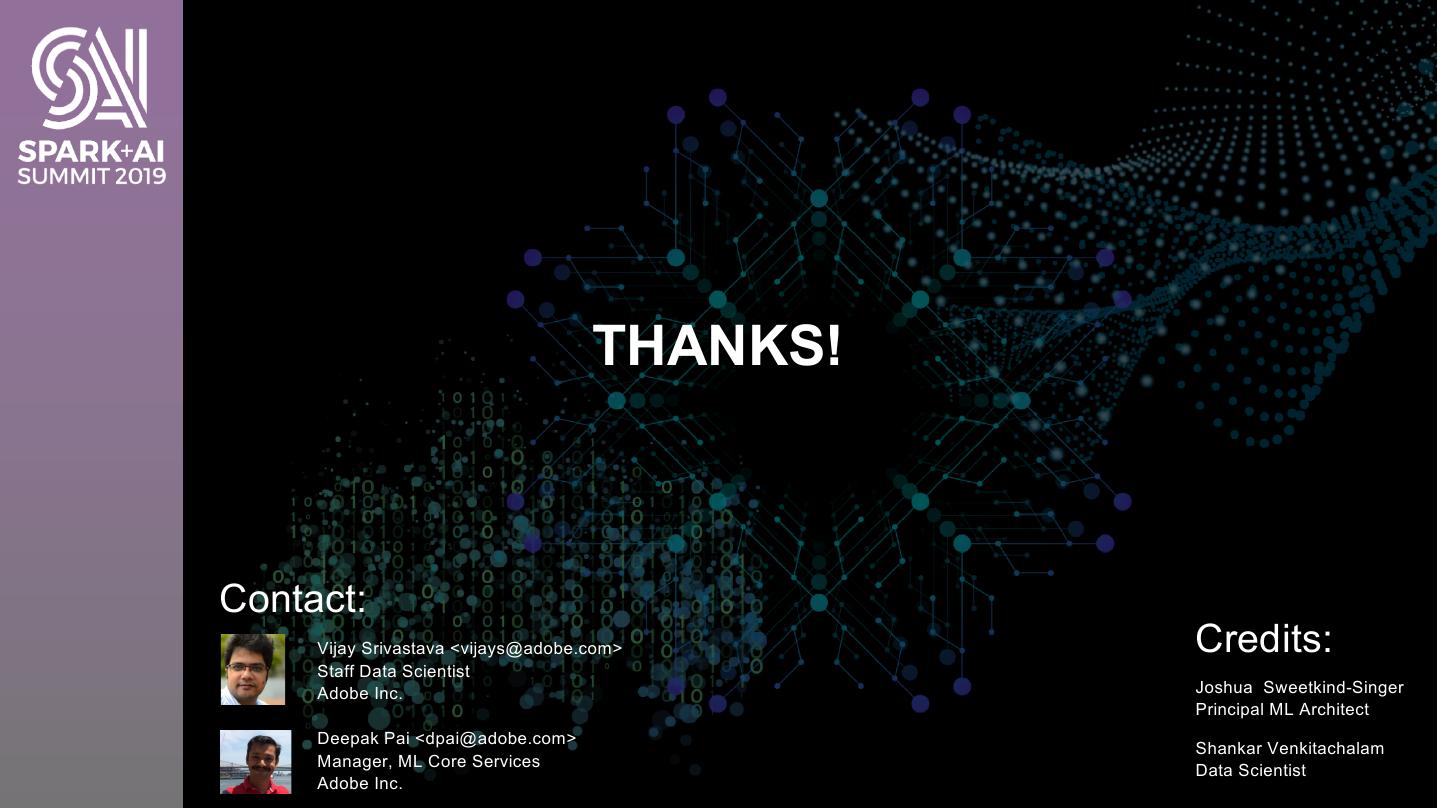 29 . THANKS! Contact: Vijay Srivastava <vijays@adobe.com> Credits: Staff Data Scientist Adobe Inc. Joshua Sweetkind-Singer Principal ML Architect Deepak Pai <dpai@adobe.com> Shankar Venkitachalam Manager, ML Core Services Data Scientist Adobe Inc.