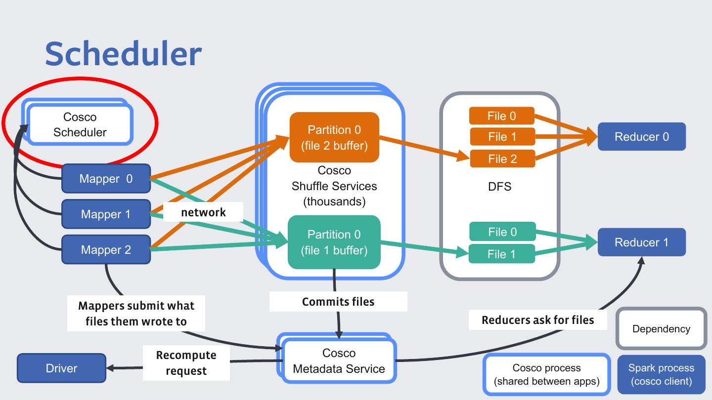 27 .Metadata File 0 Partition 0 File 1 Reducer 0 (file 2 buffer) File 2 Cosco Cosco Mapper 0 Shuffle ShuffleServices Services DFS (thousands) (10Ks) Mapper 1 network Partition 0 File 0 Reducer 1 Mapper 2 (file 1 buffer) File 1 Mappers submit what Commits files files them wrote to Reducers ask for files Dependency Cosco Metadata Service Cosco process Spark process (shared between apps) (cosco client)