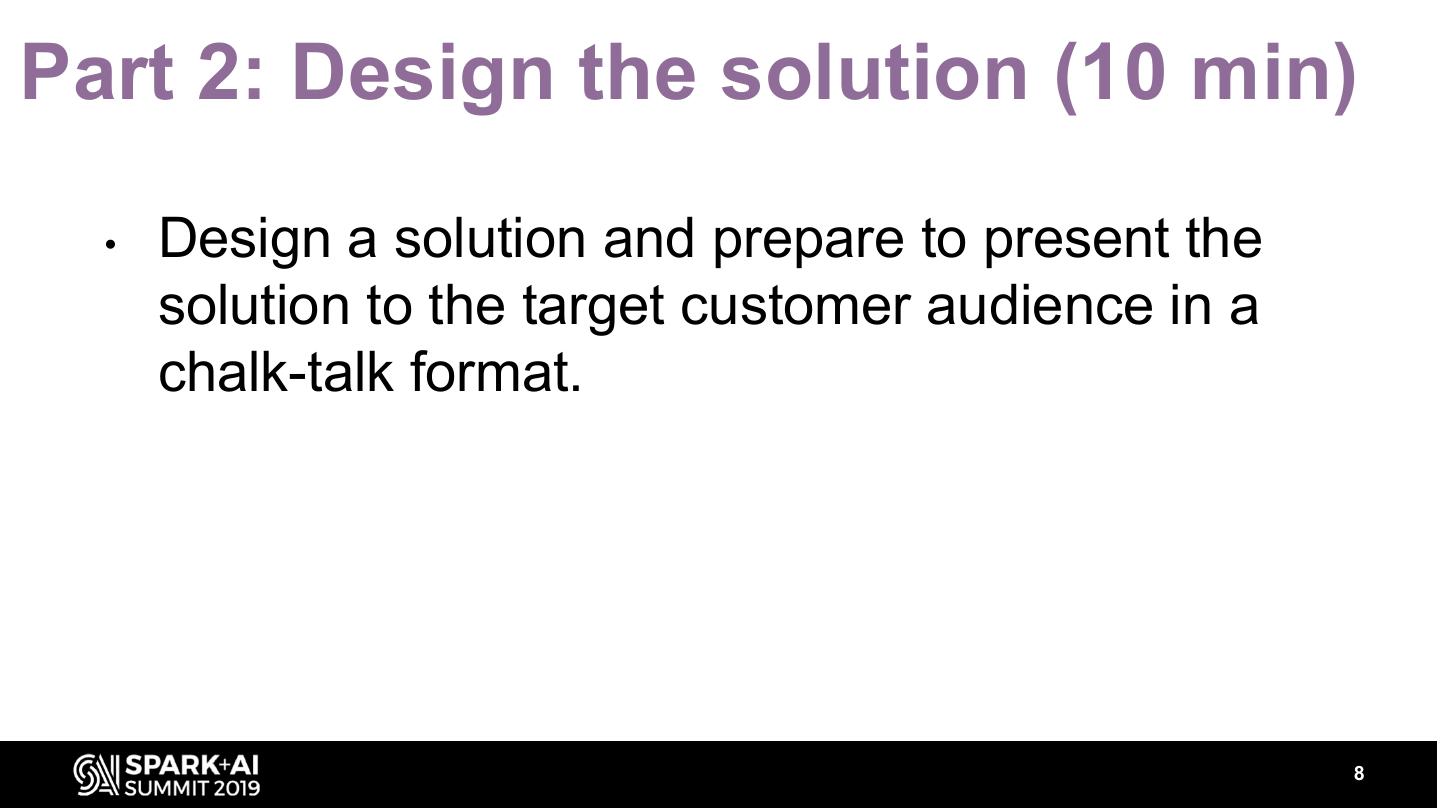 8 .Part 2: Design the solution (10 min) • Design a solution and prepare to present the solution to the target customer audience in a chalk-talk format. 8