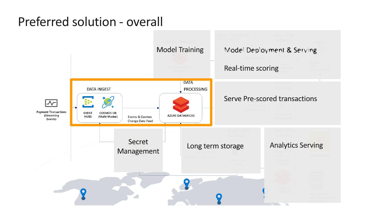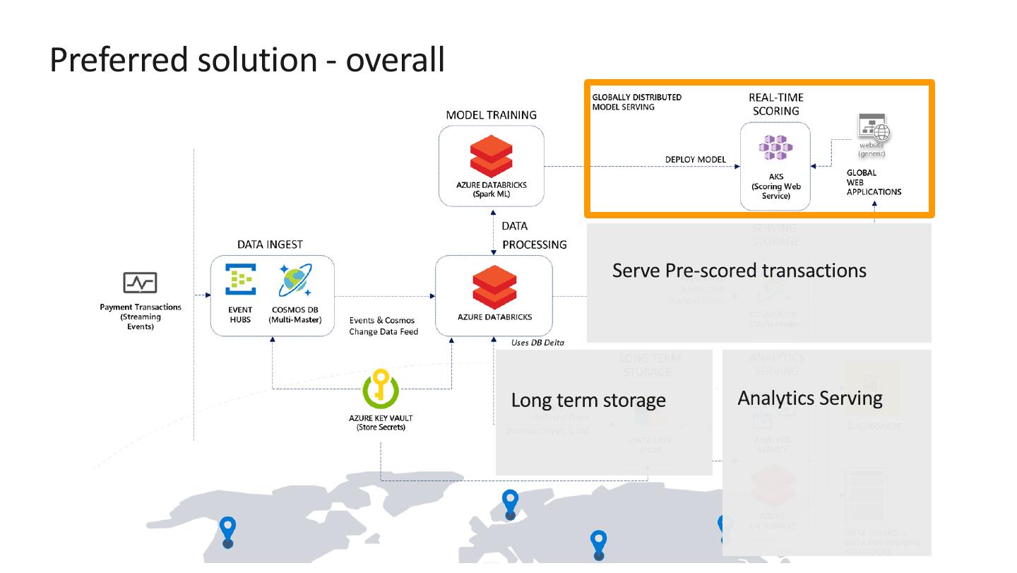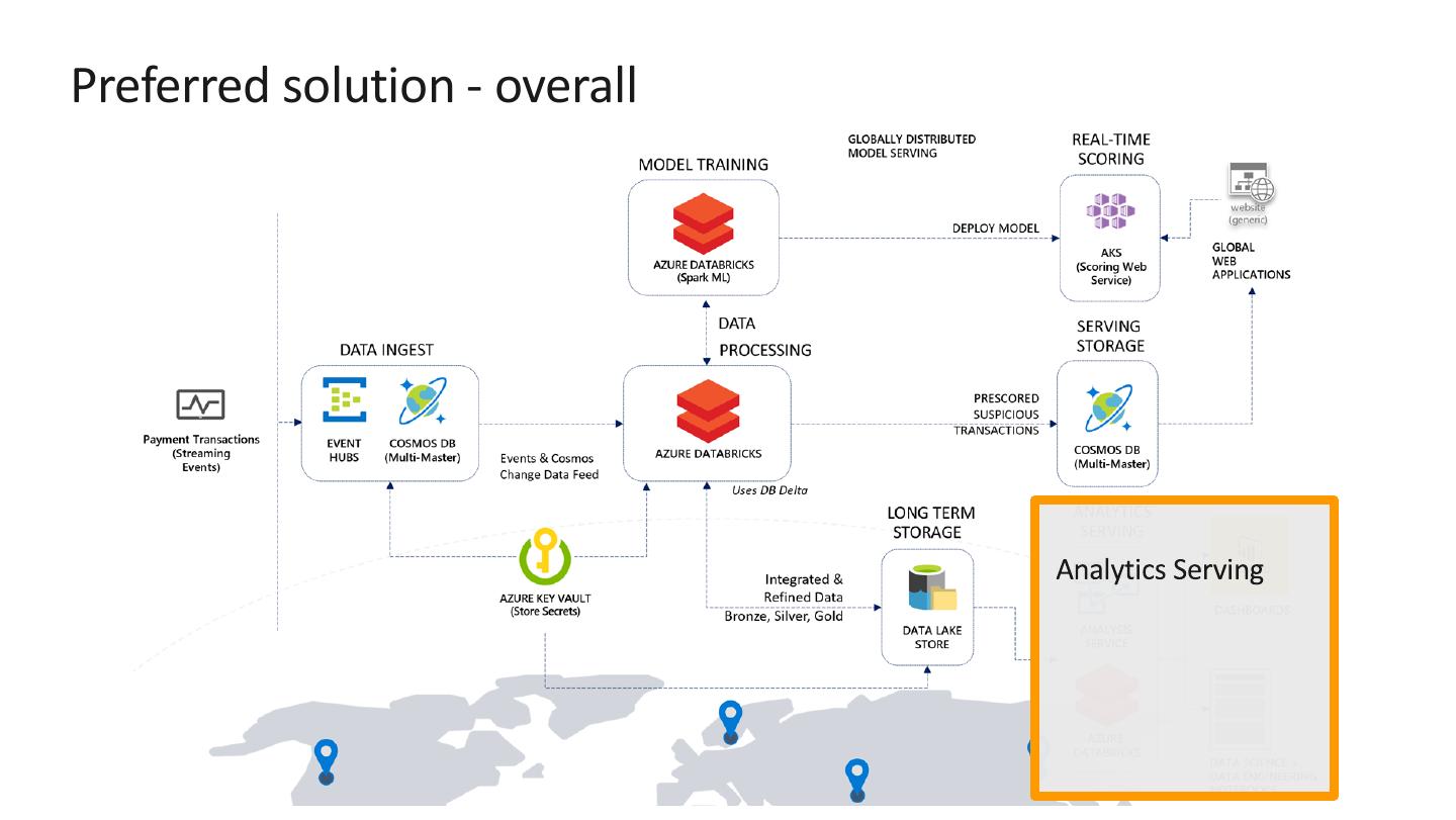 The workshop implements an innovative fraud detection solution as a PoC for a bank who provides payment processing services for commerce to their merchant customers all across the globe, helping them save costs by applying machine learning and advanced analytics to detect fraudulent transactions. Since their customers are around the world, the right solutions should minimize any latencies experienced using their service by distributing as much of the solution as possible, as closely as possible, to the regions in which their customers use the service. The workshop designs a data pipeline solution that leverages Cosmos DB for both the scalable ingest of streaming data, and the globally distributed serving of both pre-scored data and machine learning models. Cosmos DB’s major advantage when operating at a global scale is its high concurrency with low latency and predictable results.