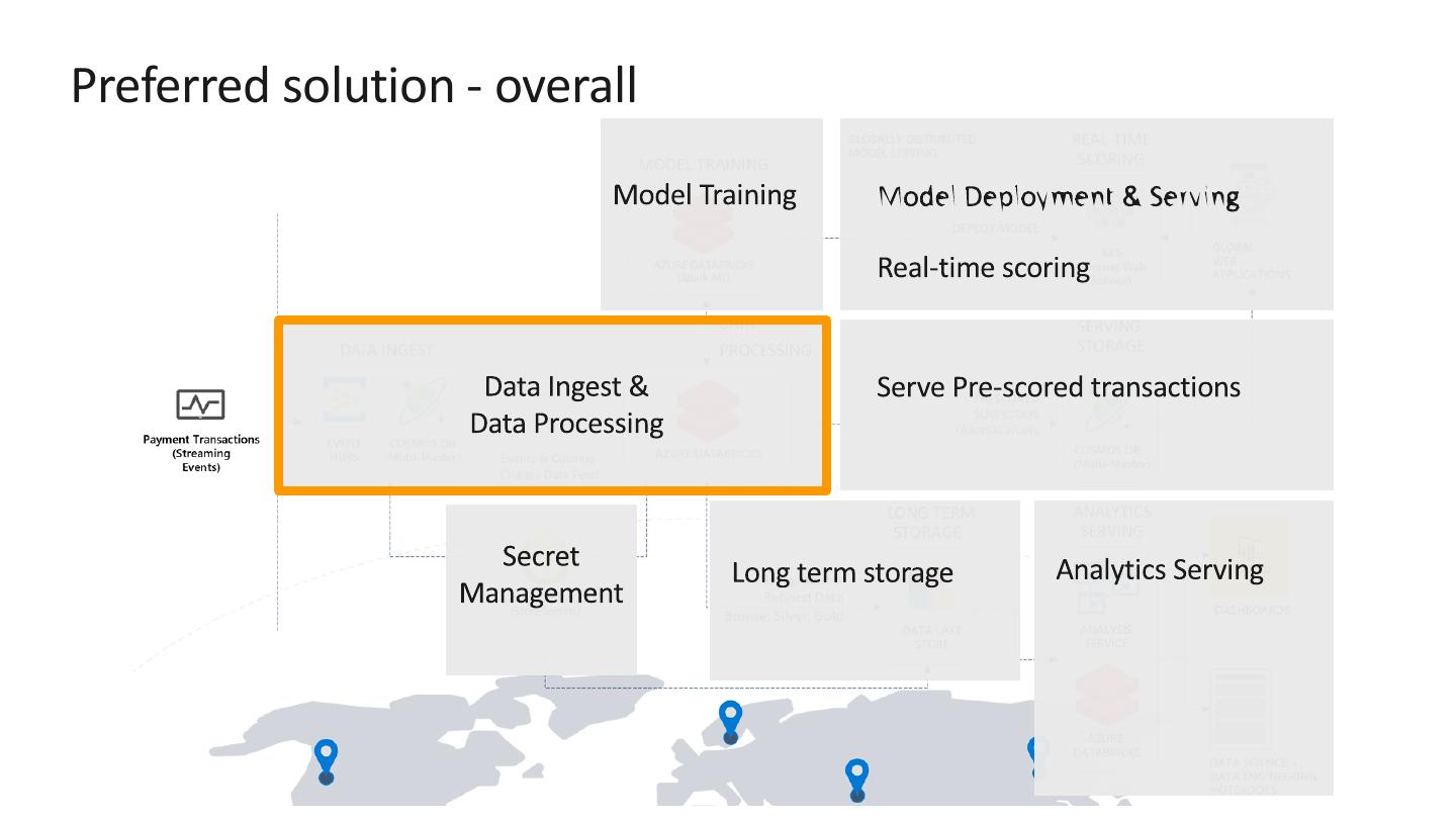 13 .Preferred solution – Data Ingest Payment transactions can be ingested in real-time using Event Hubs or Azure Cosmos DB. Factors to consider are: rate of flow (how many transactions/second) data source and compatibility level of effort to implement long-term storage needs