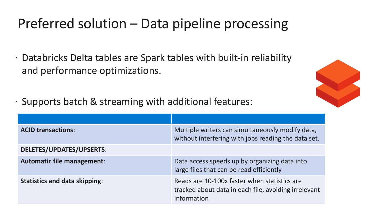 19 .Preferred solution – Data pipeline processing Databricks Delta tables are Spark tables with built-in reliability and performance optimizations. Supports batch & streaming with additional features: ACID transactions: Multiple writers can simultaneously modify data, without interfering with jobs reading the data set. DELETES/UPDATES/UPSERTS: Automatic file management: Data access speeds up by organizing data into large files that can be read efficiently Statistics and data skipping: Reads are 10-100x faster when statistics are tracked about data in each file, avoiding irrelevant information