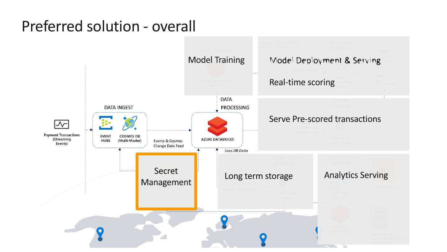 18 .Preferred solution – Data pipeline processing Store secrets such as account keys and connection strings centrally in Azure Key Vault Set Key Vault as the source for secret scopes in Azure Databricks. Secrets are [REDACTED].