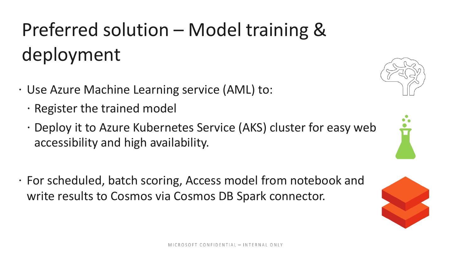 27 .Preferred solution – Model training & deployment Use Azure Machine Learning service (AML) to: Register the trained model Deploy it to Azure Kubernetes Service (AKS) cluster for easy web accessibility and high availability. For scheduled, batch scoring, Access model from notebook and write results to Cosmos via Cosmos DB Spark connector.