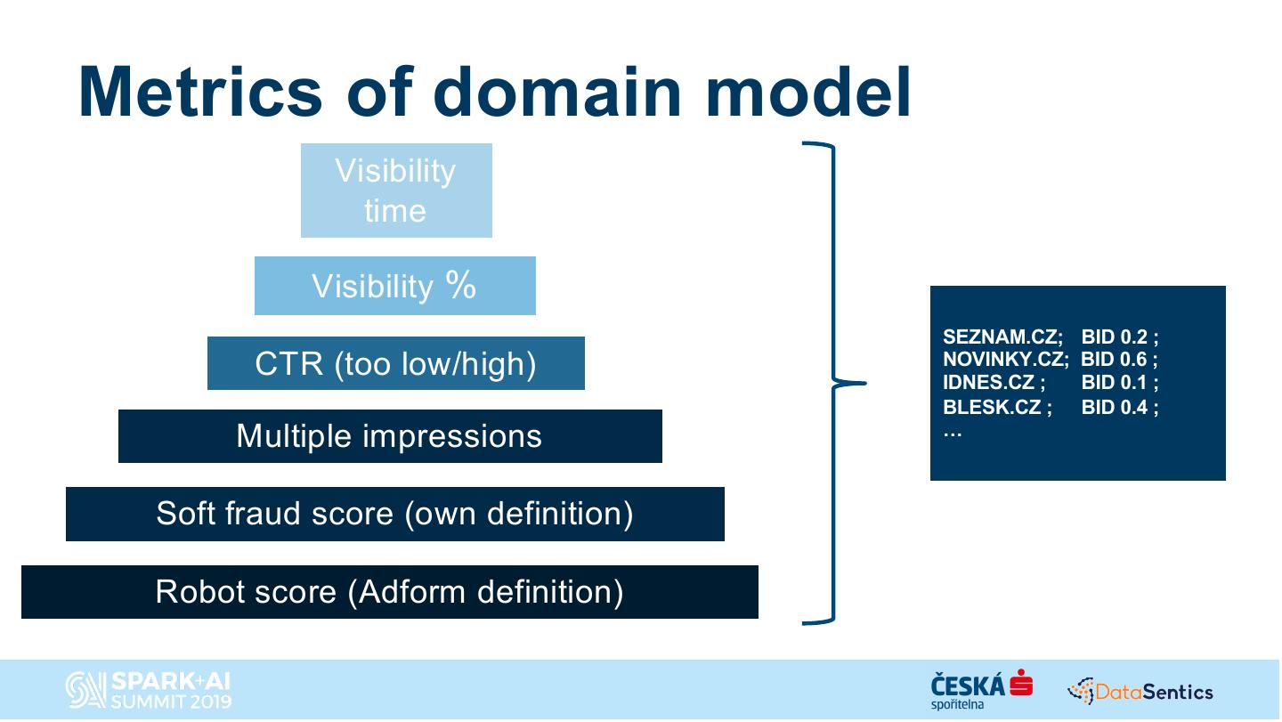 19 .Metrics of domain model Visibility time Visibility % SEZNAM.CZ; BID 0.2 ; CTR (too low/high) NOVINKY.CZ; IDNES.CZ ; BID 0.6 ; BID 0.1 ; BLESK.CZ ; BID 0.4 ; Multiple impressions … Soft fraud score (own definition) Robot score (Adform definition)