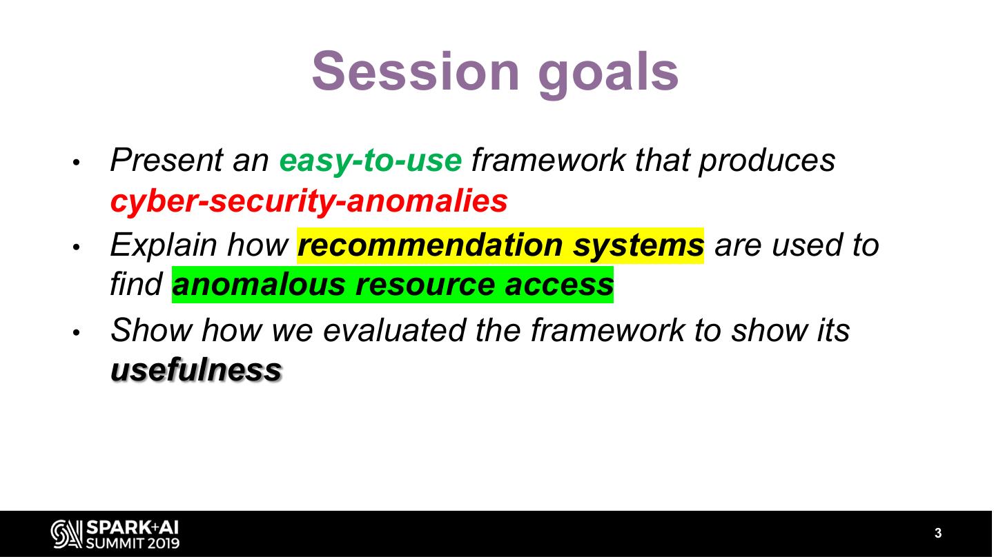 3 . Session goals • Present an easy-to-use framework that produces cyber-security-anomalies • Explain how recommendation systems are used to find anomalous resource access • Show how we evaluated the framework to show its usefulness 3