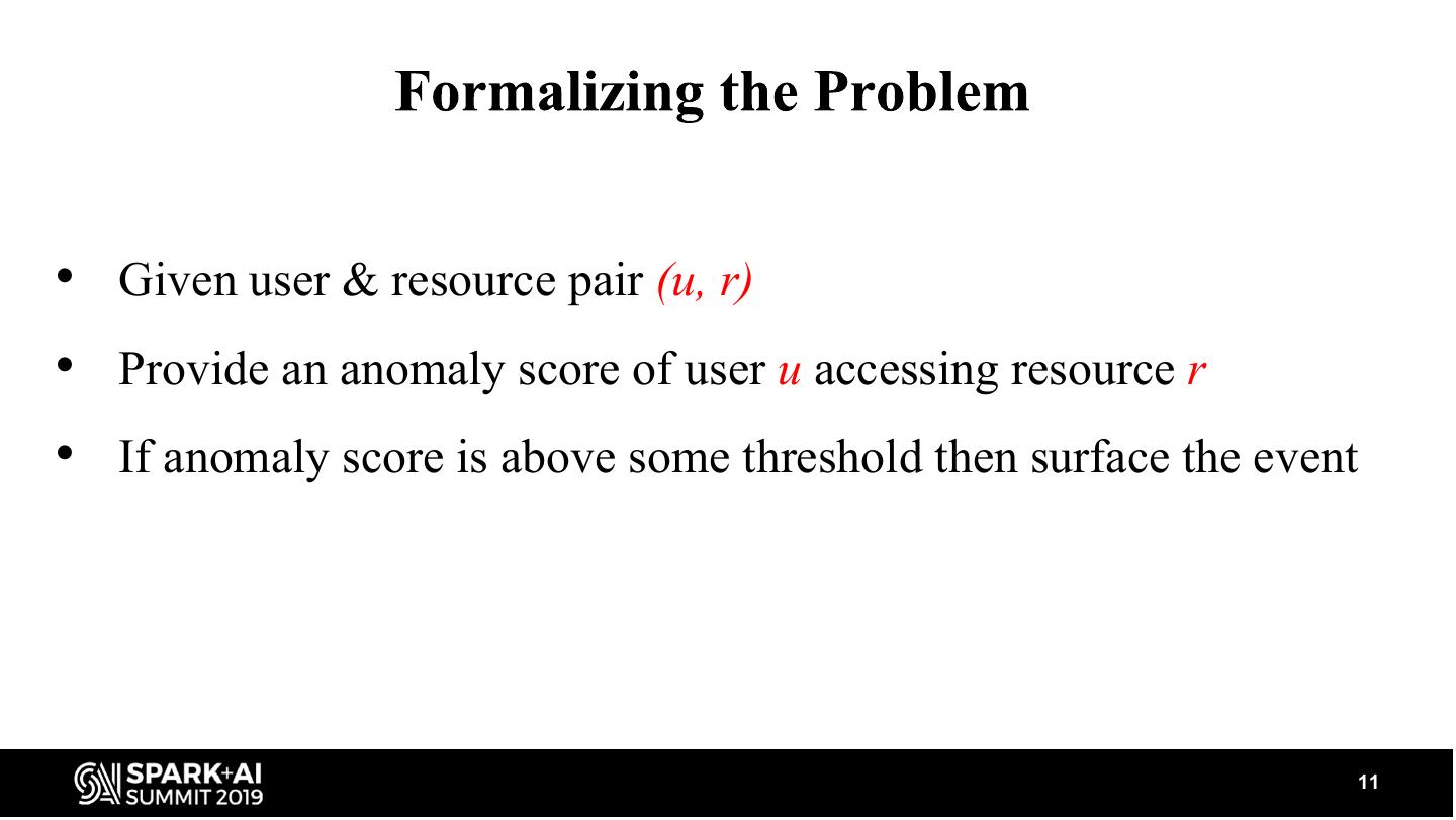 11 .• Given user & resource pair (u, r) • Provide an anomaly score of user u accessing resource r • If anomaly score is above some threshold then surface the event 11