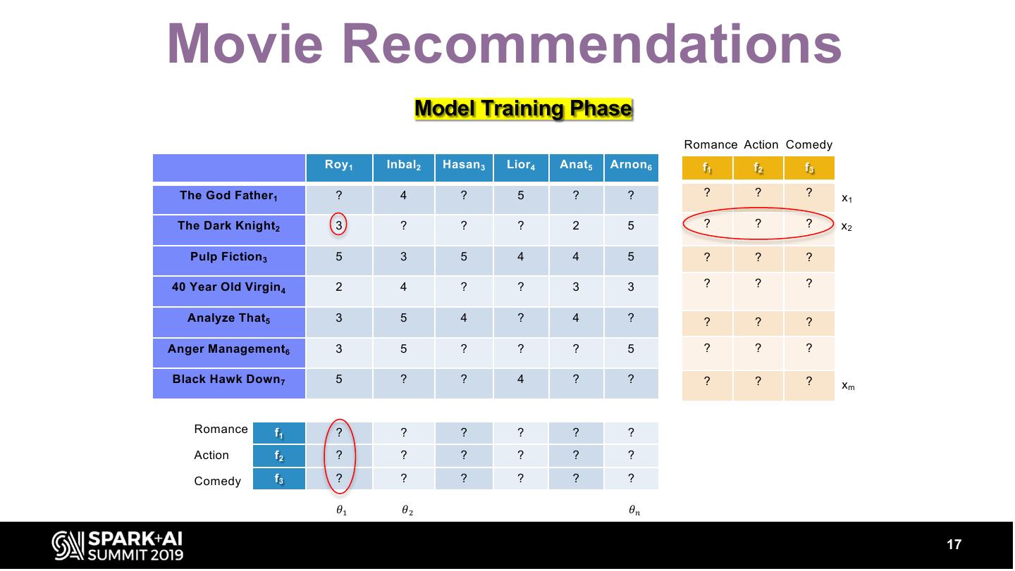 16 .Movie Recommendations Model Training Phase Roy 1 Inbal2 Hasan 3 Lior4 Anat5 Arnon 6 The God Father1 4 5 The Dark Knight2 3 2 5 Pulp Fiction 3 5 3 5 4 4 5 40 Year Old Virgin 4 2 4 3 3 Analyze That5 3 5 4 4 Anger Management6 3 5 5 Black Hawk Down 7 5 4 16