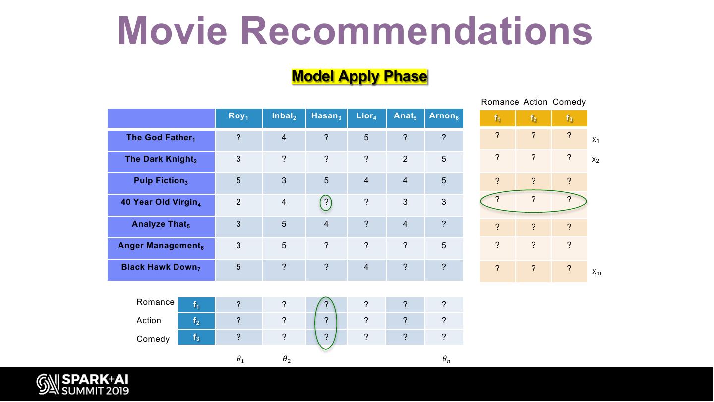 18 .Movie Recommendations Model Training Phase Romance Action Comedy Roy 1 Inbal2 Hasan 3 Lior4 Anat5 Arnon 6 f1 f2 f3 The God Father1 ? 4 ? 5 ? ? ? ? ? x1 The Dark Knight2 3 ? ? ? 2 5 ? ? ? x2 Pulp Fiction 3 5 3 5 4 4 5 ? ? ? 40 Year Old Virgin 4 2 4 ? ? 3 3 ? ? ? Analyze That5 3 5 4 ? 4 ? ? ? ? Anger Management6 3 5 ? ? ? 5 ? ? ? Black Hawk Down 7 5 ? ? 4 ? ? ? ? ? xm Romance f1 ? ? ? ? ? ? Action f2 ? ? ? ? ? ? Comedy f3 ? ? ? ? ? ? 𝜃" 𝜃# 𝜃$ 18