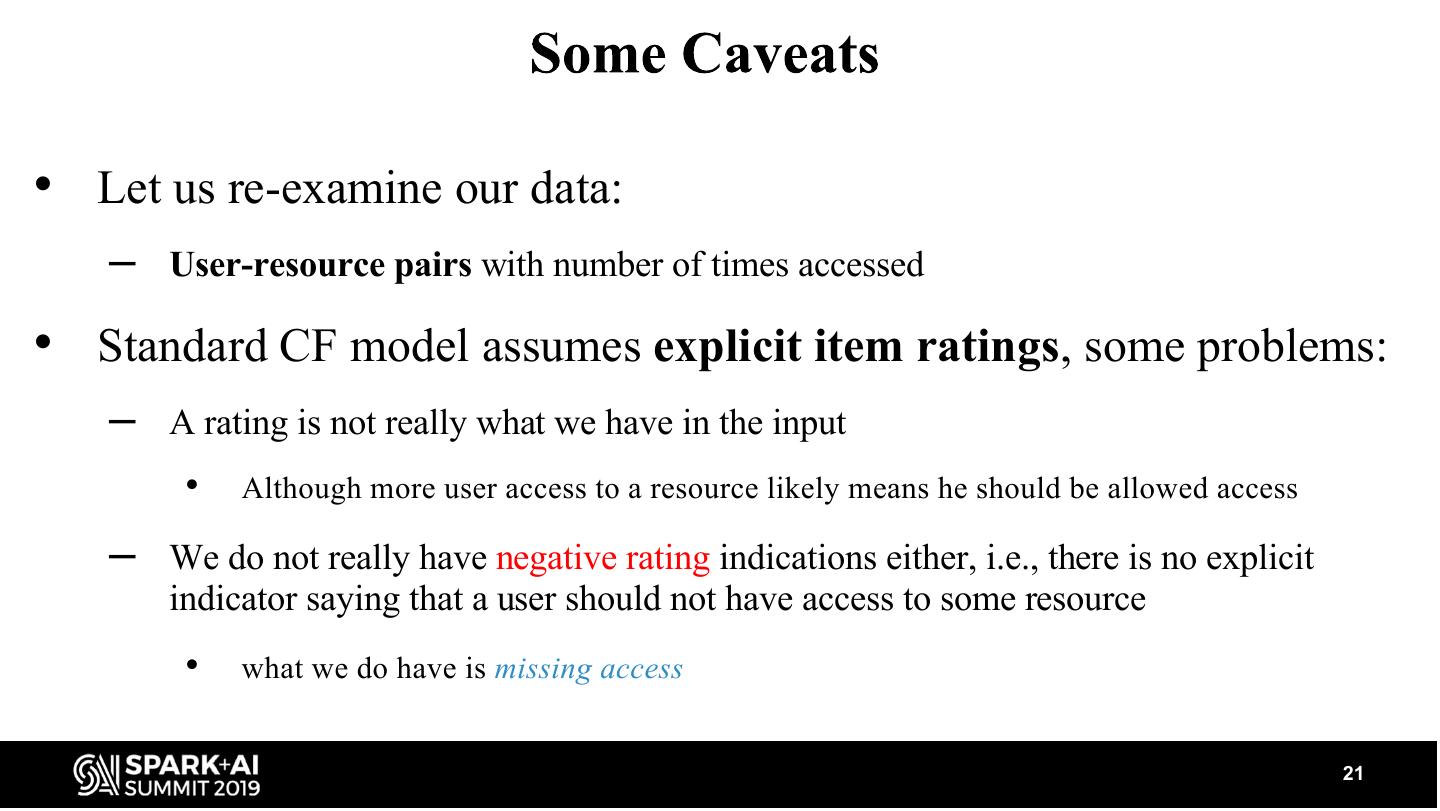 21 .• Let us re-examine our data: – User-resource pairs with number of times accessed • Standard CF model assumes explicit item ratings, some problems: – A rating is not really what we have in the input • Although more user access to a resource likely means he should be allowed access – We do not really have negative rating indications either, i.e., there is no explicit indicator saying that a user should not have access to some resource • what we do have is missing access 21