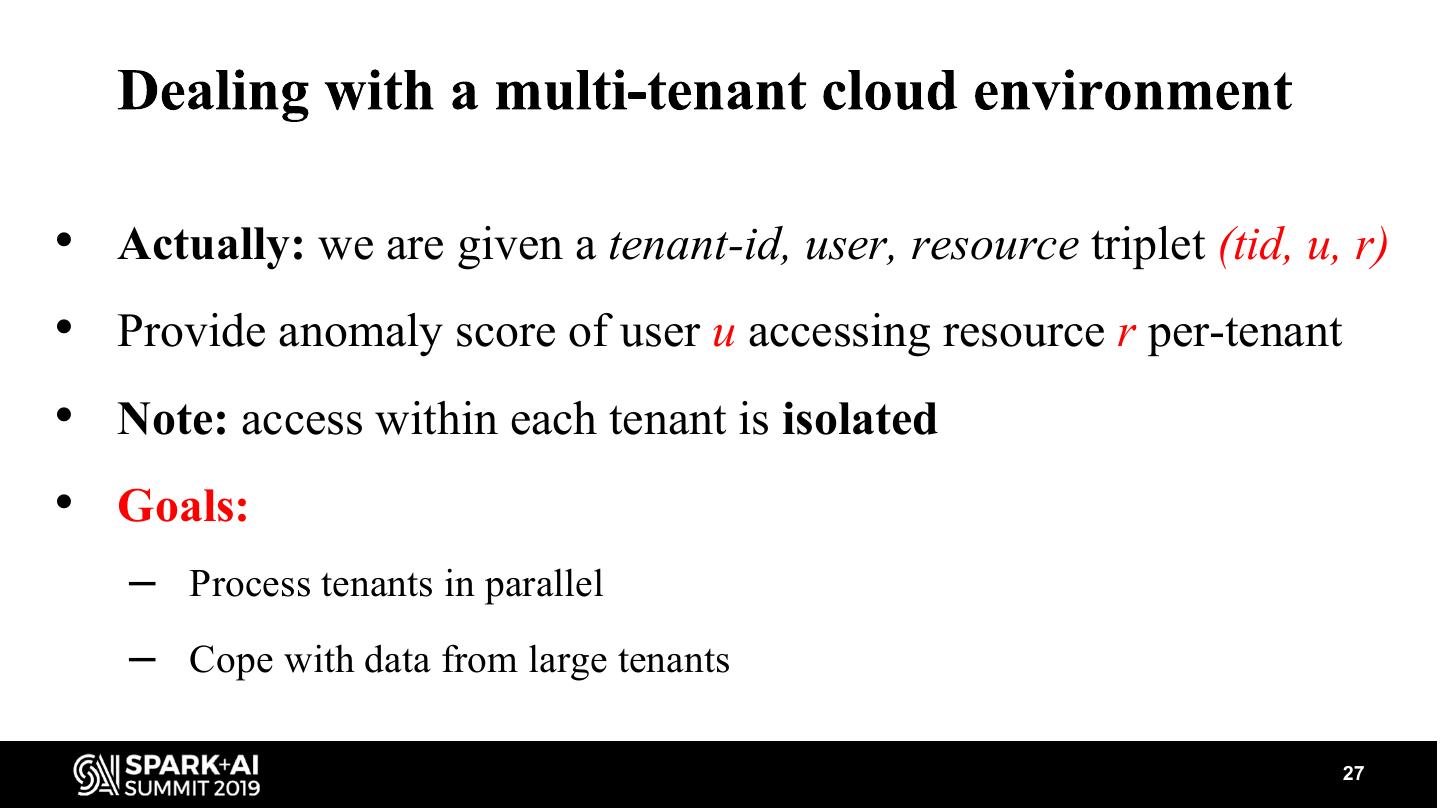 27 .• Actually: we are given a tenant-id, user, resource triplet (tid, u, r) • Provide anomaly score of user u accessing resource r per-tenant • Note: access within each tenant is isolated • Goals: – Process tenants in parallel – Cope with data from large tenants 27