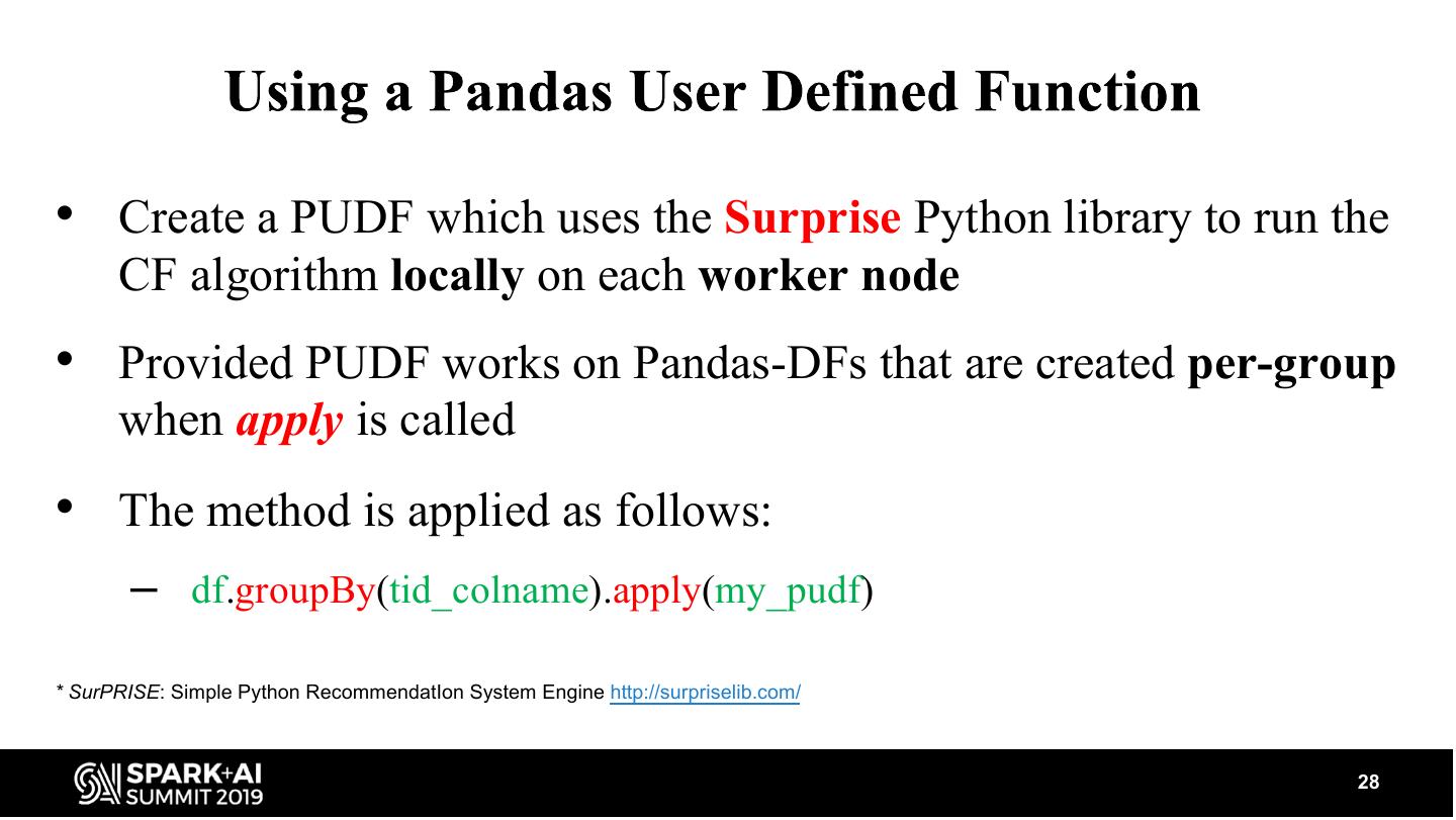 28 .• Create a PUDF which uses the Surprise Python library to run the CF algorithm locally on each worker node • Provided PUDF works on Pandas-DFs that are created per-group when apply is called • The method is applied as follows: – df.groupBy(tid_colname).apply(my_pudf) * SurPRISE: Simple Python RecommendatIon System Engine http://surpriselib.com/ 28