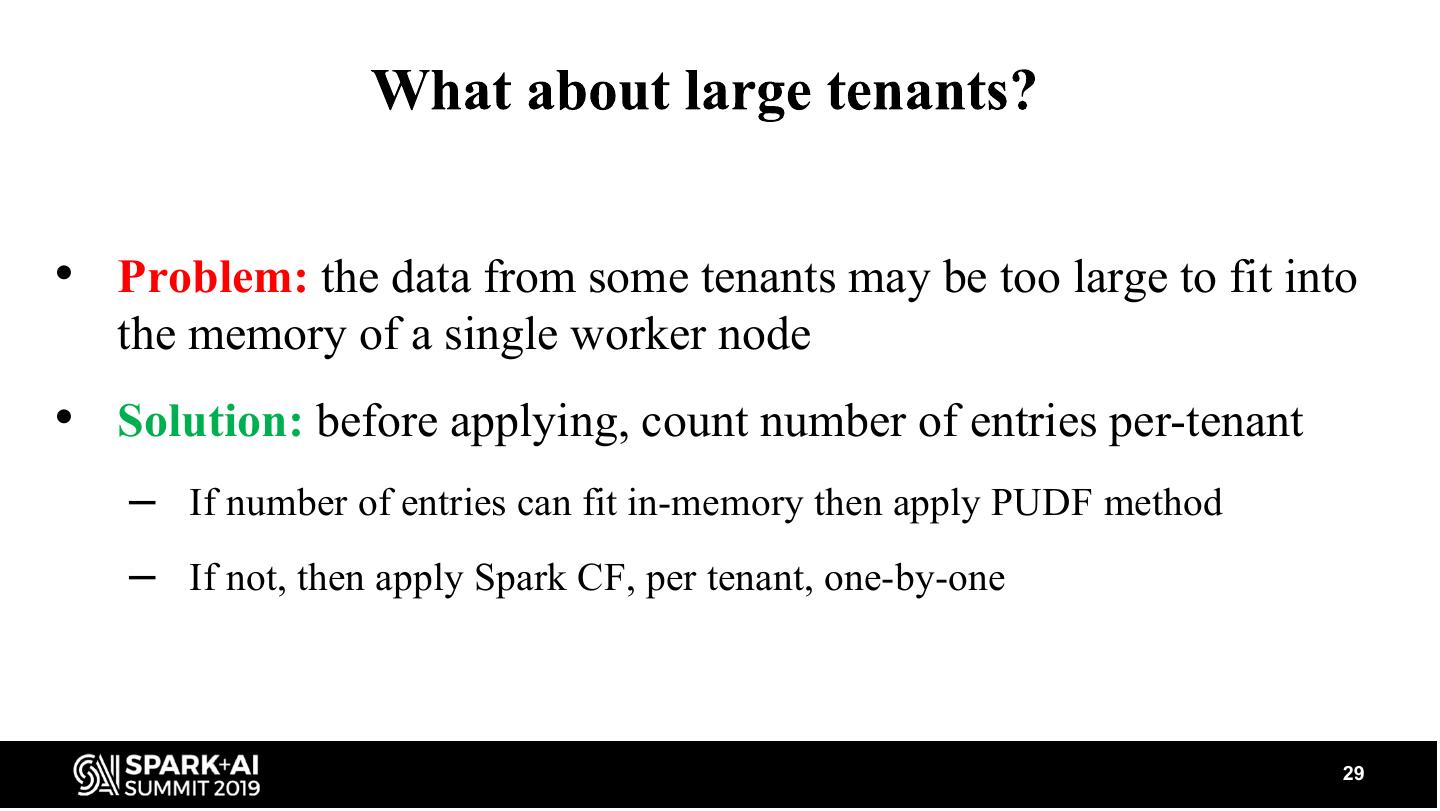 29 .• Problem: the data from some tenants may be too large to fit into the memory of a single worker node • Solution: before applying, count number of entries per-tenant – If number of entries can fit in-memory then apply PUDF method – If not, then apply Spark CF, per tenant, one-by-one 29