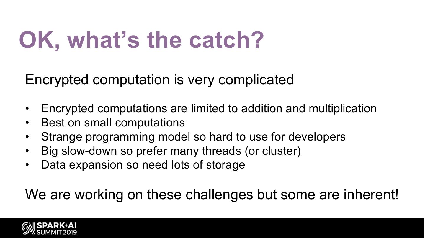 Homomorphic encryption is a relatively new type of encryption technology that allows computations to be done directly on encrypted data. ”Microsoft SEAL” is an easy-to-use homomorphic encryption library that enables software engineers to build end-to-end encrypted data storage and computation services where the customer never needs to share their key with the service. Bottlenecks in the technology are in performance and the size of encrypted data, and Spark, along with hardware acceleration, can help solve these scalability challenges. In this talk we will describe homomorphic encryption at a high level, and see what the performance of the technology can be when complex encrypted computations are executed in Spark. The talk will include demos.