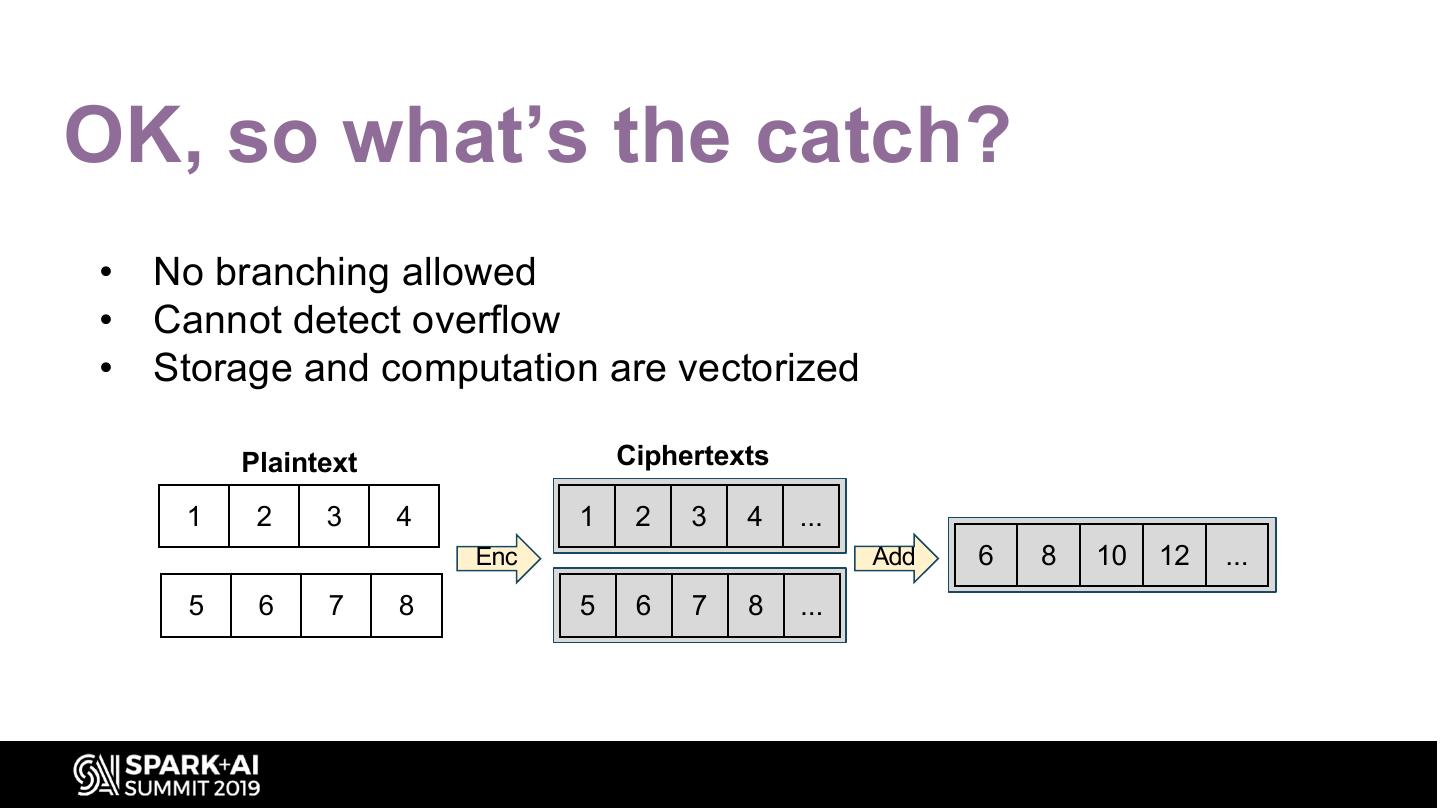 13 .OK, so what’s the catch? • No branching allowed • Cannot detect overflow • Storage and computation are vectorized Plaintext Ciphertexts 1 2 3 4 1 2 3 4 ... Enc Add 6 8 10 12 ... 5 6 7 8 5 6 7 8 ...