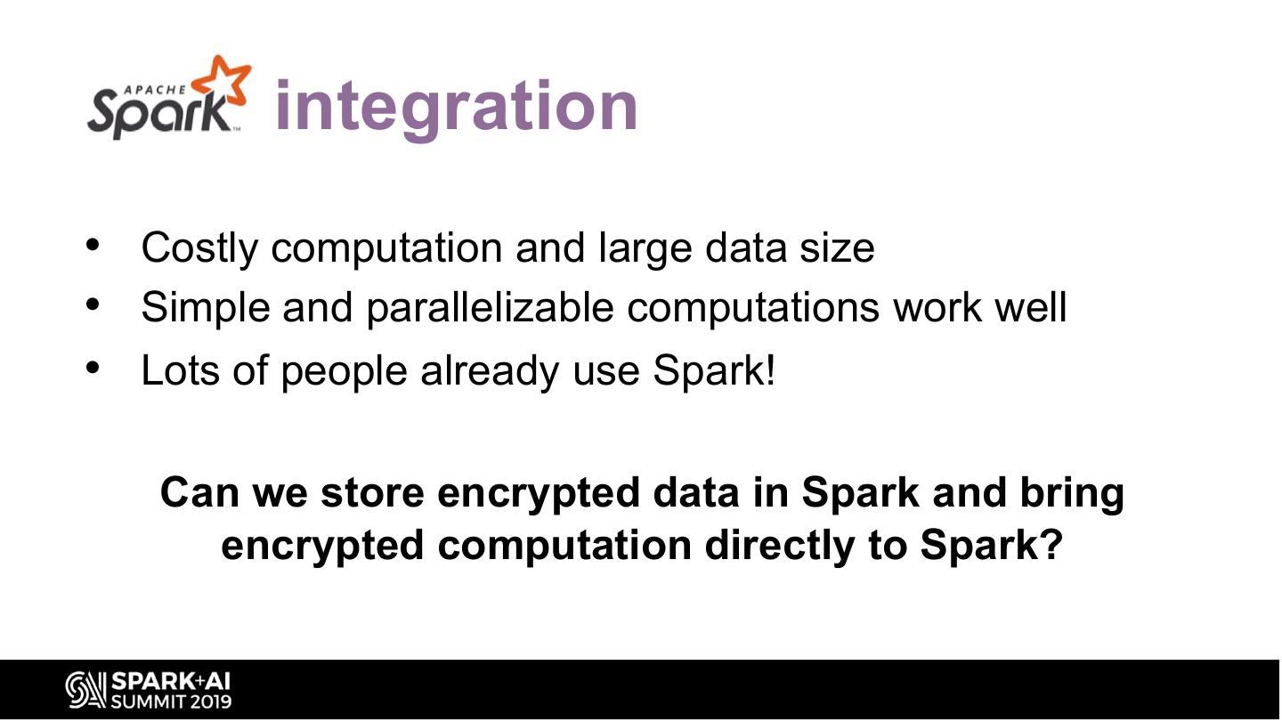 17 .Spark integration • Costly computation and large data size • Simple and parallelizable computations work well • Lots of people already use Spark! Can we store encrypted data in Spark and bring encrypted computation directly to Spark?