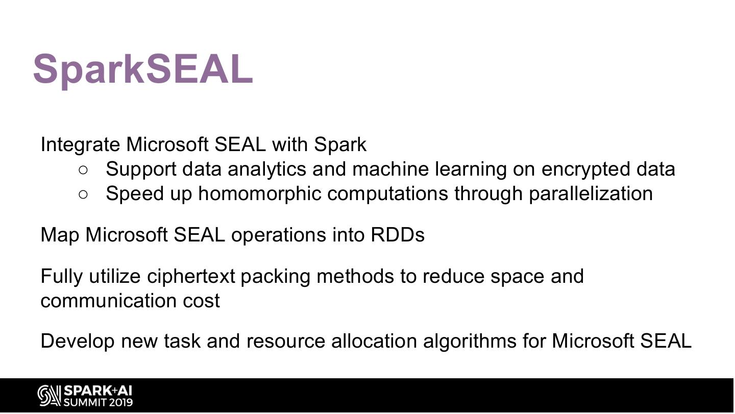 20 .SparkSEAL Integrate Microsoft SEAL with Spark ○ Support data analytics and machine learning on encrypted data ○ Speed up homomorphic computations through parallelization Map Microsoft SEAL operations into RDDs Fully utilize ciphertext packing methods to reduce space and communication cost Develop new task and resource allocation algorithms for Microsoft SEAL