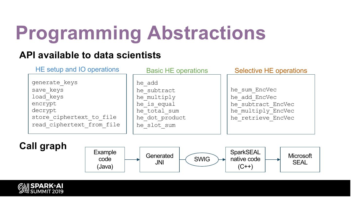 23 .Programming Abstractions API available to data scientists HE setup and IO operations Basic HE operations Selective HE operations generate_keys he_add save_keys he_subtract he_sum_EncVec load_keys he_multiply he_add_EncVec encrypt he_is_equal he_subtract_EncVec decrypt he_total_sum he_multiply_EncVec store_ciphertext_to_file he_dot_product he_retrieve_EncVec read_ciphertext_from_file he_slot_sum Call graph Example SparkSEAL Generated Microsoft code SWIG native code JNI SEAL (Java) (C++)