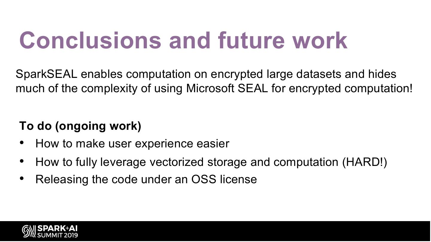 24 .Conclusions and future work SparkSEAL enables computation on encrypted large datasets and hides much of the complexity of using Microsoft SEAL for encrypted computation! To do (ongoing work) • How to make user experience easier • How to fully leverage vectorized storage and computation (HARD!) • Releasing the code under an OSS license