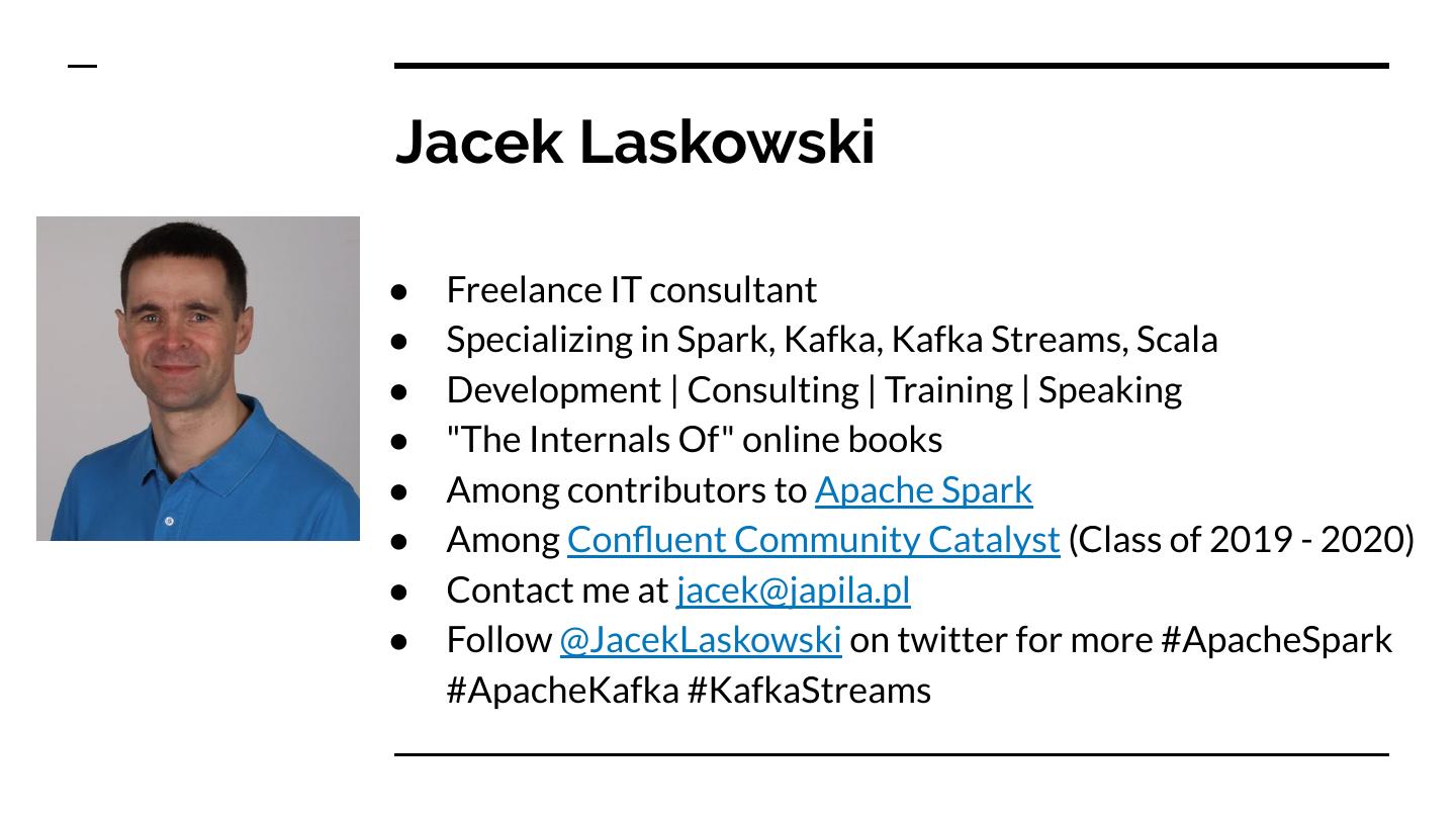 2 .Jacek Laskowski ● Freelance IT consultant ● Specializing in Spark, Kafka, Kafka Streams, Scala ● Development | Consulting | Training | Speaking ● "The Internals Of" online books ● Among contributors to Apache Spark ● Among Confluent Community Catalyst (Class of 2019 - 2020) ● Contact me at jacek@japila.pl ● Follow @JacekLaskowski on twitter for more #ApacheSpark #ApacheKafka #KafkaStreams