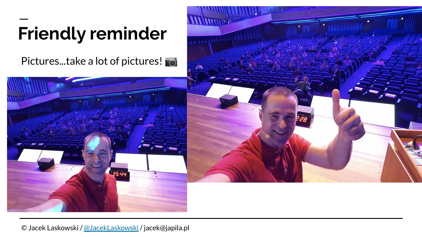 3 .Friendly reminder Pictures...take a lot of pictures! 📷 © Jacek Laskowski / @JacekLaskowski / jacek@japila.pl