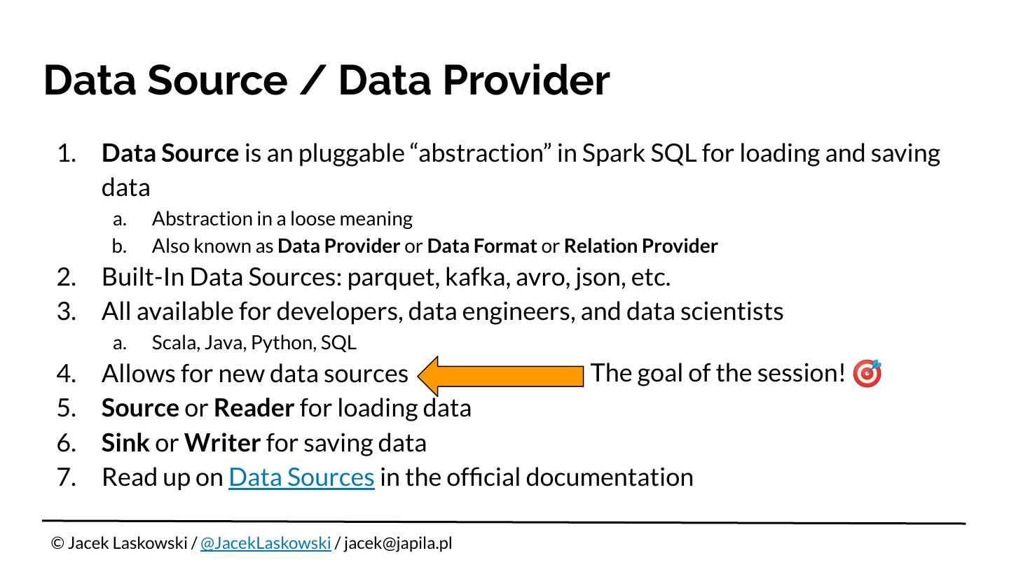Spark SQL 2.4.x gives you two Data Source APIs that your structured queries can use to access data in custom formats, possibly in unsupported storage systems. There is the older and almost legacy DataSource API V1 and what you can consider a modern DataSource API V2. This talk will introduce you to the main entities of each DataSource API and show you the steps how to write a new data source live on stage. That should give you enough knowledge on expanding available data sources in Spark SQL with new ones.