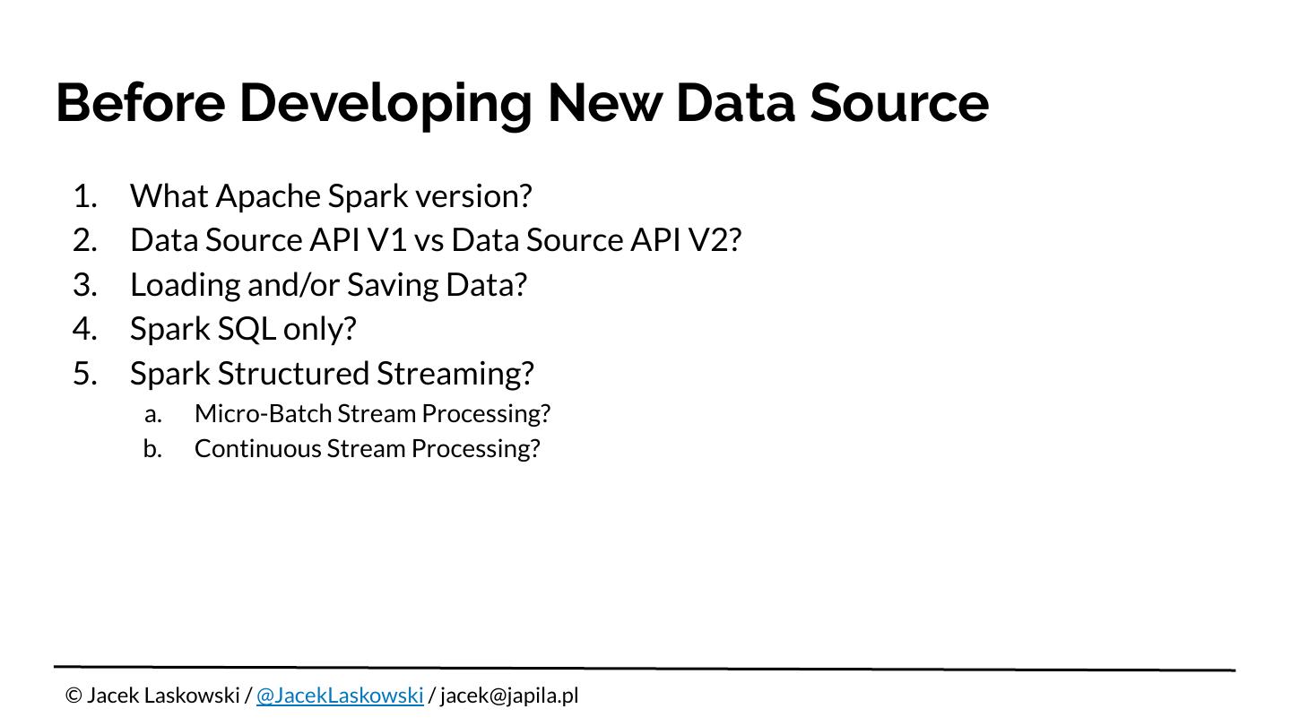 6 .Before Developing New Data Source 1. What Apache Spark version? 2. Data Source API V1 vs Data Source API V2? 3. Loading and/or Saving Data? 4. Spark SQL only? 5. Spark Structured Streaming? a. Micro-Batch Stream Processing? b. Continuous Stream Processing? © Jacek Laskowski / @JacekLaskowski / jacek@japila.pl