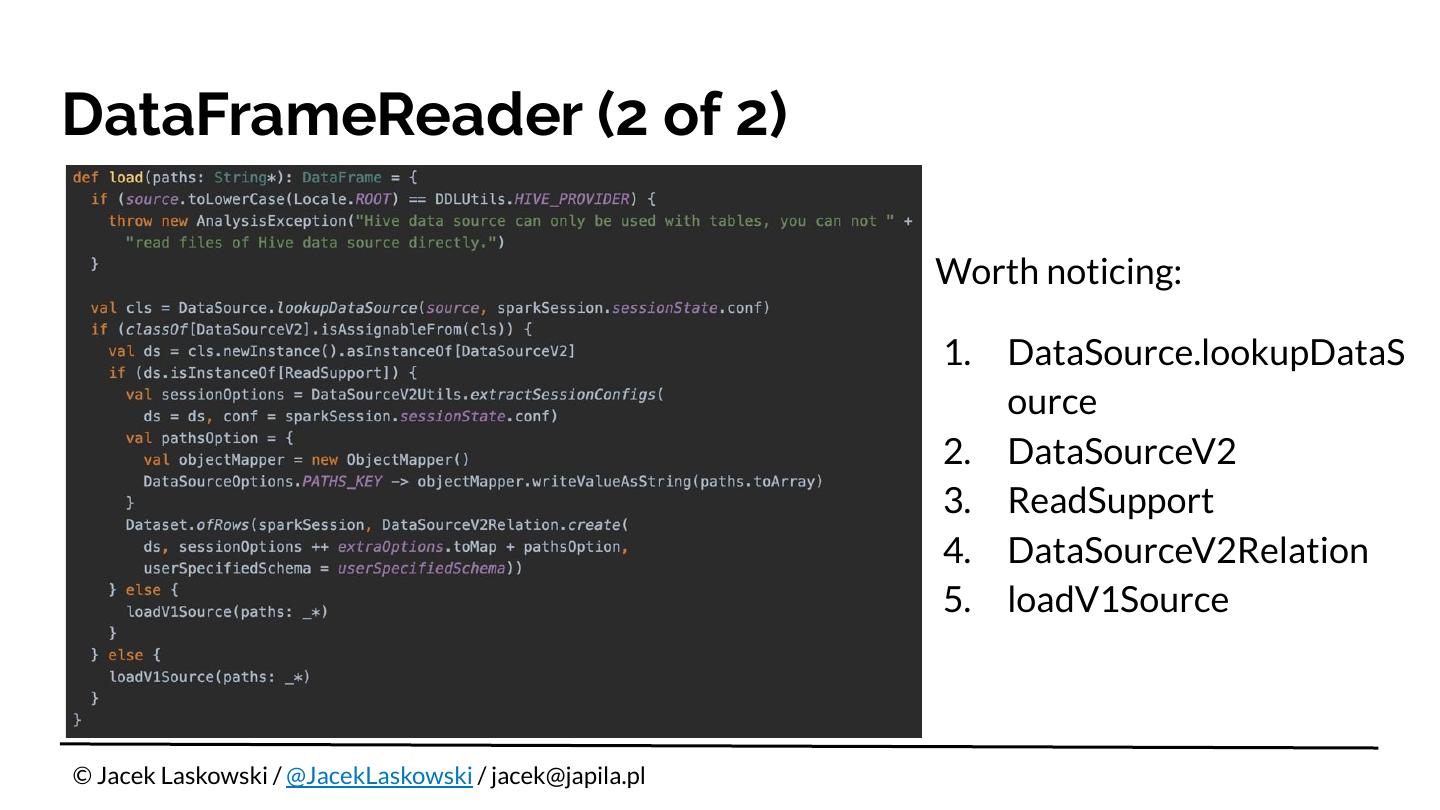 8 .DataFrameReader (2 of 2) Worth noticing: 1. DataSource.lookupDataS ource 2. DataSourceV2 3. ReadSupport 4. DataSourceV2Relation 5. loadV1Source © Jacek Laskowski / @JacekLaskowski / jacek@japila.pl
