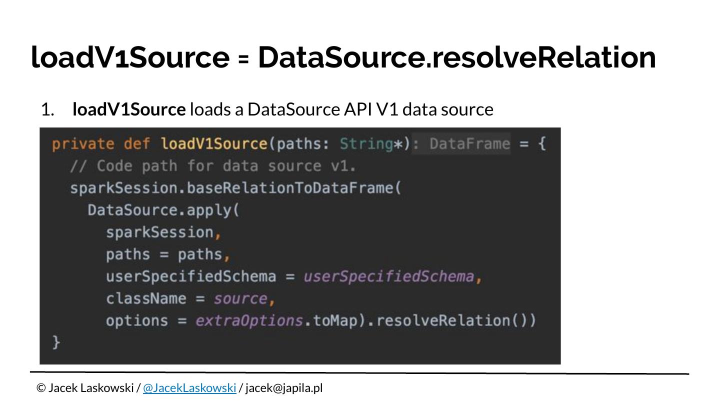 10 .loadV1Source = DataSource.resolveRelation 1. loadV1Source loads a DataSource API V1 data source © Jacek Laskowski / @JacekLaskowski / jacek@japila.pl
