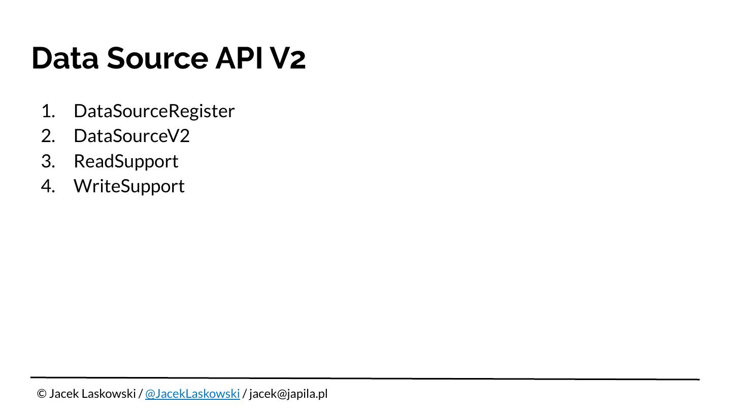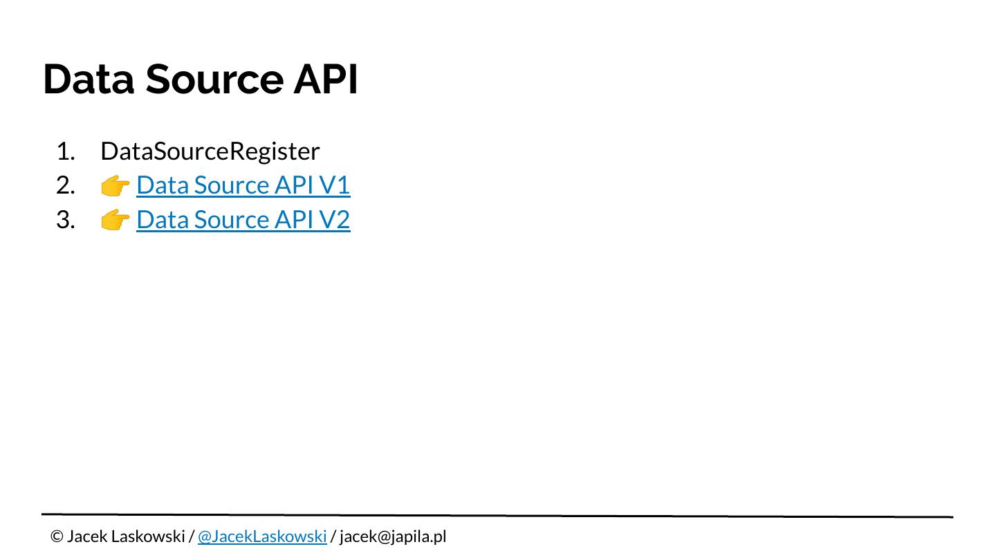11 .Data Source API 1. DataSourceRegister 2. 👉 Data Source API V1 3. 👉 Data Source API V2 © Jacek Laskowski / @JacekLaskowski / jacek@japila.pl