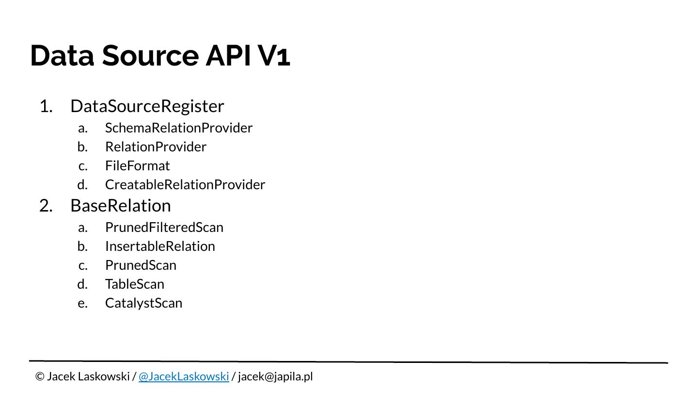 13 .Data Source API V1 1. DataSourceRegister a. SchemaRelationProvider b. RelationProvider c. FileFormat d. CreatableRelationProvider 2. BaseRelation a. PrunedFilteredScan b. InsertableRelation c. PrunedScan d. TableScan e. CatalystScan © Jacek Laskowski / @JacekLaskowski / jacek@japila.pl