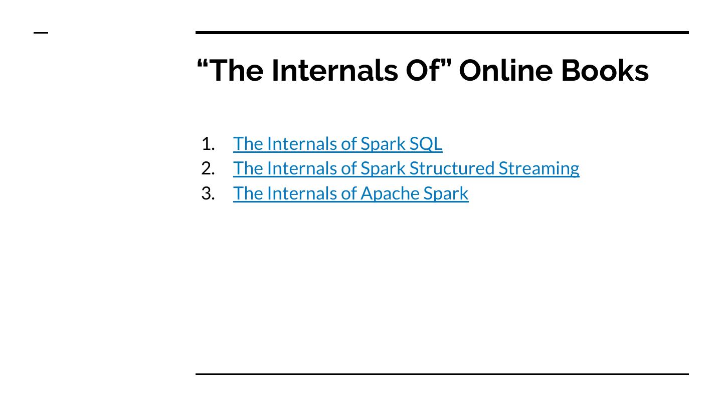 15 .“The Internals Of” Online Books 1. The Internals of Spark SQL 2. The Internals of Spark Structured Streaming 3. The Internals of Apache Spark