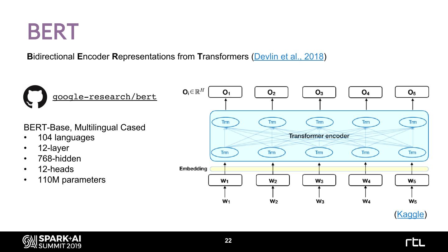 22 .BERT Bidirectional Encoder Representations from Transformers (Devlin et al., 2018) google-research/bert BERT-Base, Multilingual Cased • 104 languages • 12-layer • 768-hidden • 12-heads • 110M parameters (Kaggle) 22