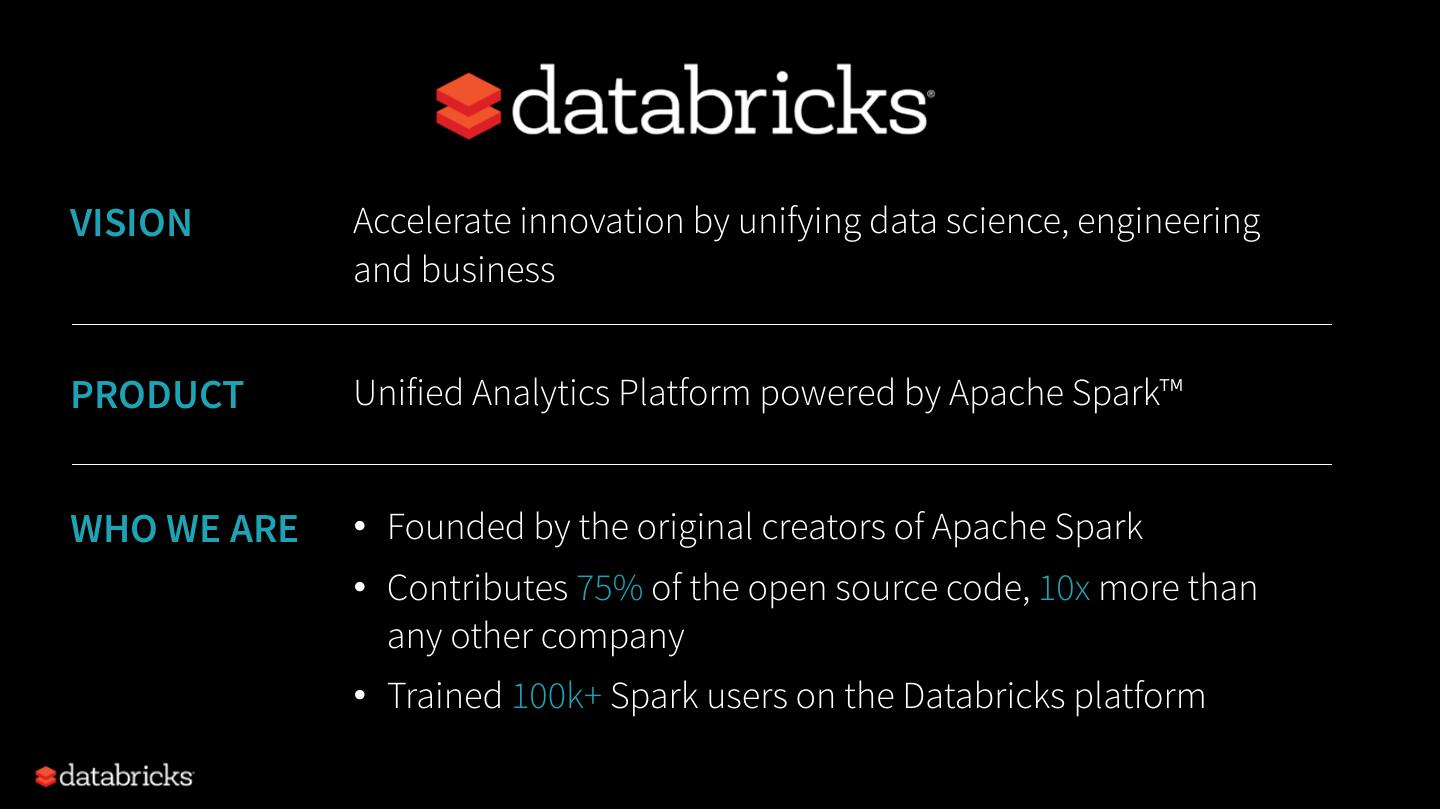 2 .VISION Accelerate innovation by unifying data science, engineering and business PRODUCT Unified Analytics Platform powered by Apache Spark™ WHO WE ARE • Founded by the original creators of Apache Spark • Contributes 75% of the open source code, 10x more than any other company • Trained 100k+ Spark users on the Databricks platform