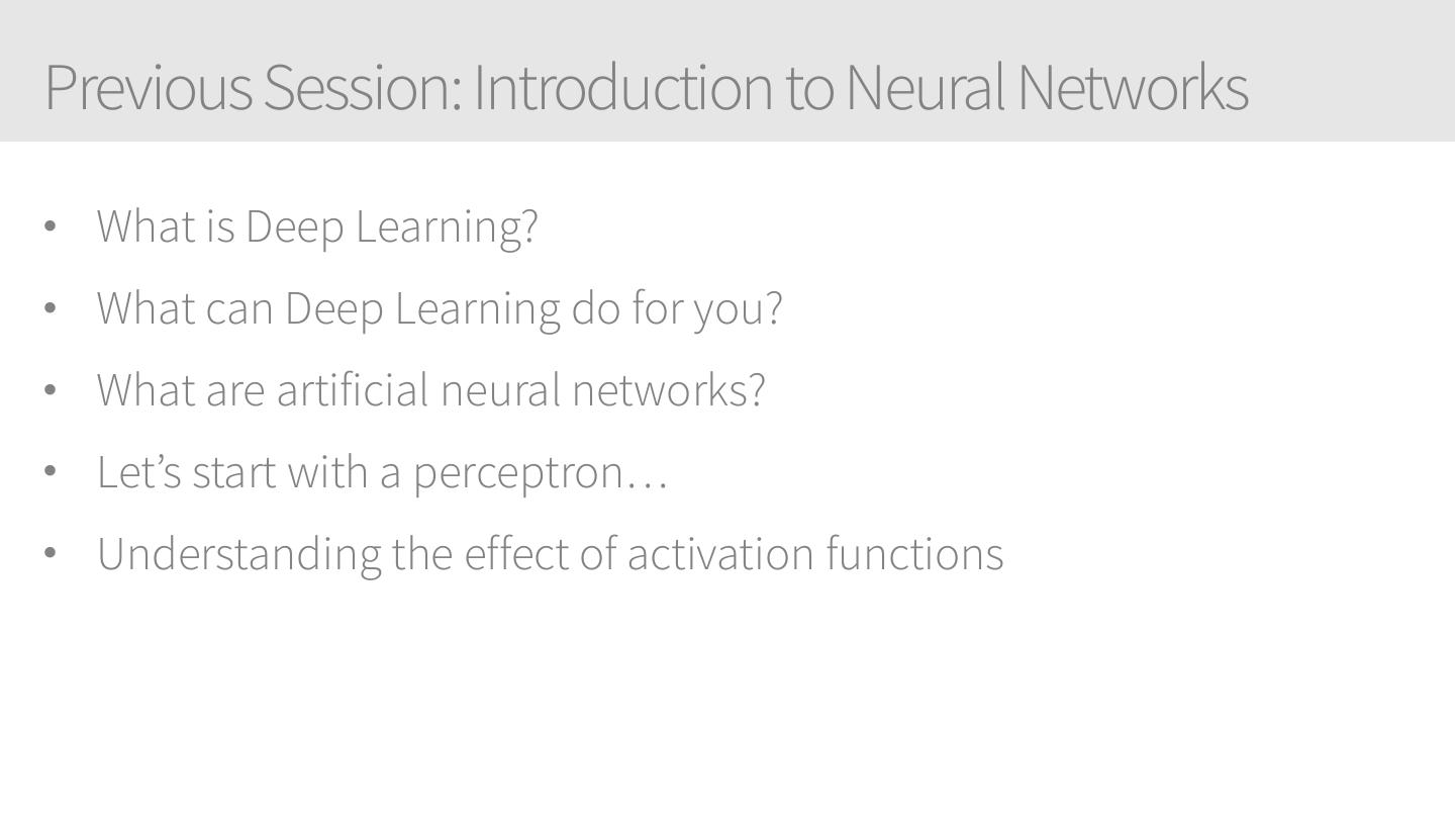 5 .Previous Session: Introduction to Neural Networks • What is Deep Learning? • What can Deep Learning do for you? • What are artificial neural networks? • Let’s start with a perceptron… • Understanding the effect of activation functions