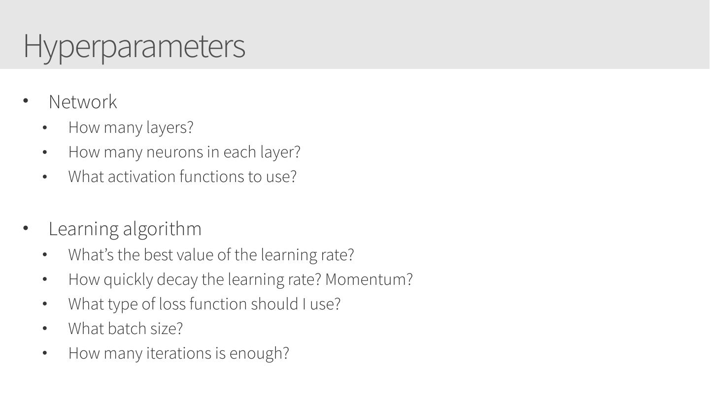 17 .Hyperparameters Learning algorithm • What’s the best value of the learning rate? • How quickly decay the learning rate? Momentum? • What type of loss function should I use? • What batch size? • How many iterations is enough?