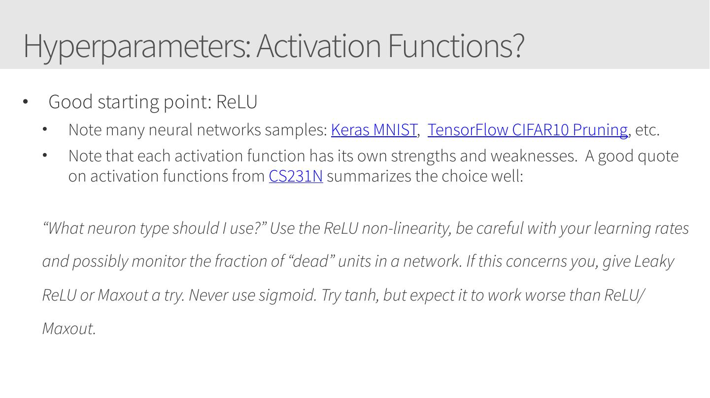 15 .Hyperparameters: Activation Functions? • Good starting point: ReLU • Note many neural networks samples: Keras MNIST, TensorFlow CIFAR10 Pruning, etc. • Note that each activation function has its own strengths and weaknesses. A good quote on activation functions from CS231N summarizes the choice well: “What neuron type should I use?” Use the ReLU non-linearity, be careful with your learning rates and possibly monitor the fraction of “dead” units in a network. If this concerns you, give Leaky ReLU or Maxout a try. Never use sigmoid. Try tanh, but expect it to work worse than ReLU/ Maxout.