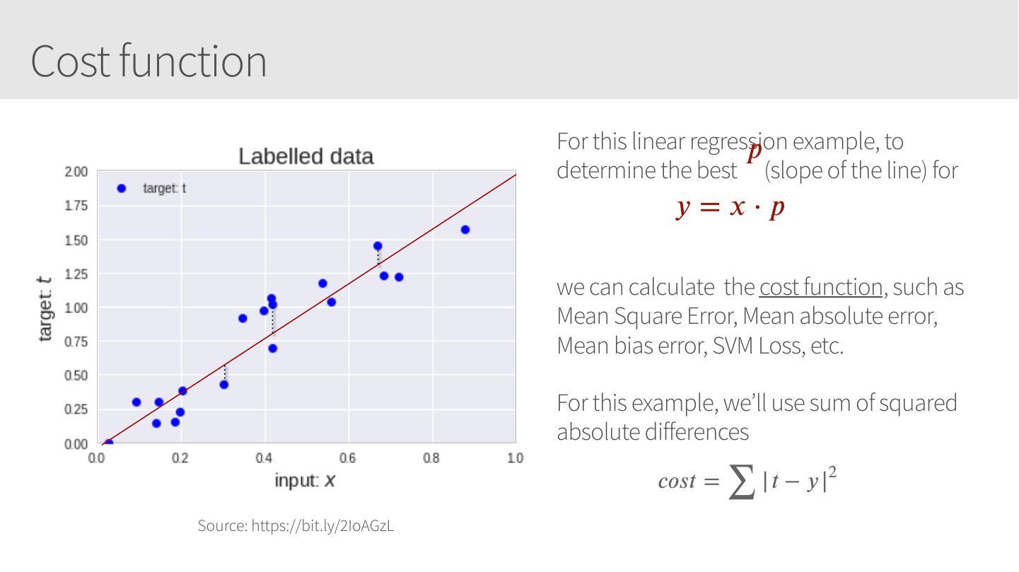 19 .Cost function 𝑝 example, to For this linear regression determine the best (slope of the line) for 𝑦 =𝑥⋅𝑝 we can calculate the cost function, such as Mean Square Error, Mean absolute error, Mean bias error, SVM Loss, etc. For this example, we’ll use sum of squared absolute differences | 𝑡 − 𝑦 |2 ∑ 𝑐𝑜𝑠𝑡 = Source: https://bit.ly/2IoAGzL