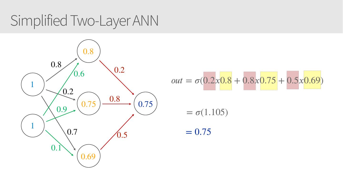 26 .Simplified Two-Layer ANN 0.8 0.8 0.6 0.2 1 𝑜𝑢𝑡 = 𝜎(0.2𝑥0.8 + 0.8𝑥0.75 + 0.5𝑥0.69) 0.2 0.8 0.75 0.75 0.9 = 𝜎(1.105) 1 0.7 0.5 = 0.75 0.1 0.69