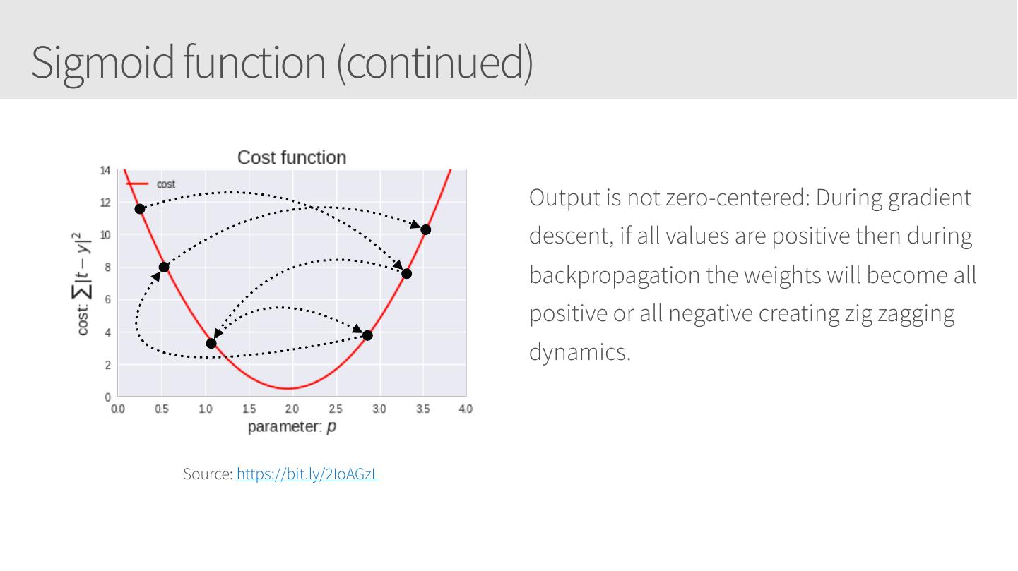 29 .Sigmoid function (continued) Output is not zero-centered: During gradient descent, if all values are positive then during backpropagation the weights will become all positive or all negative creating zig zagging dynamics. Source: https://bit.ly/2IoAGzL