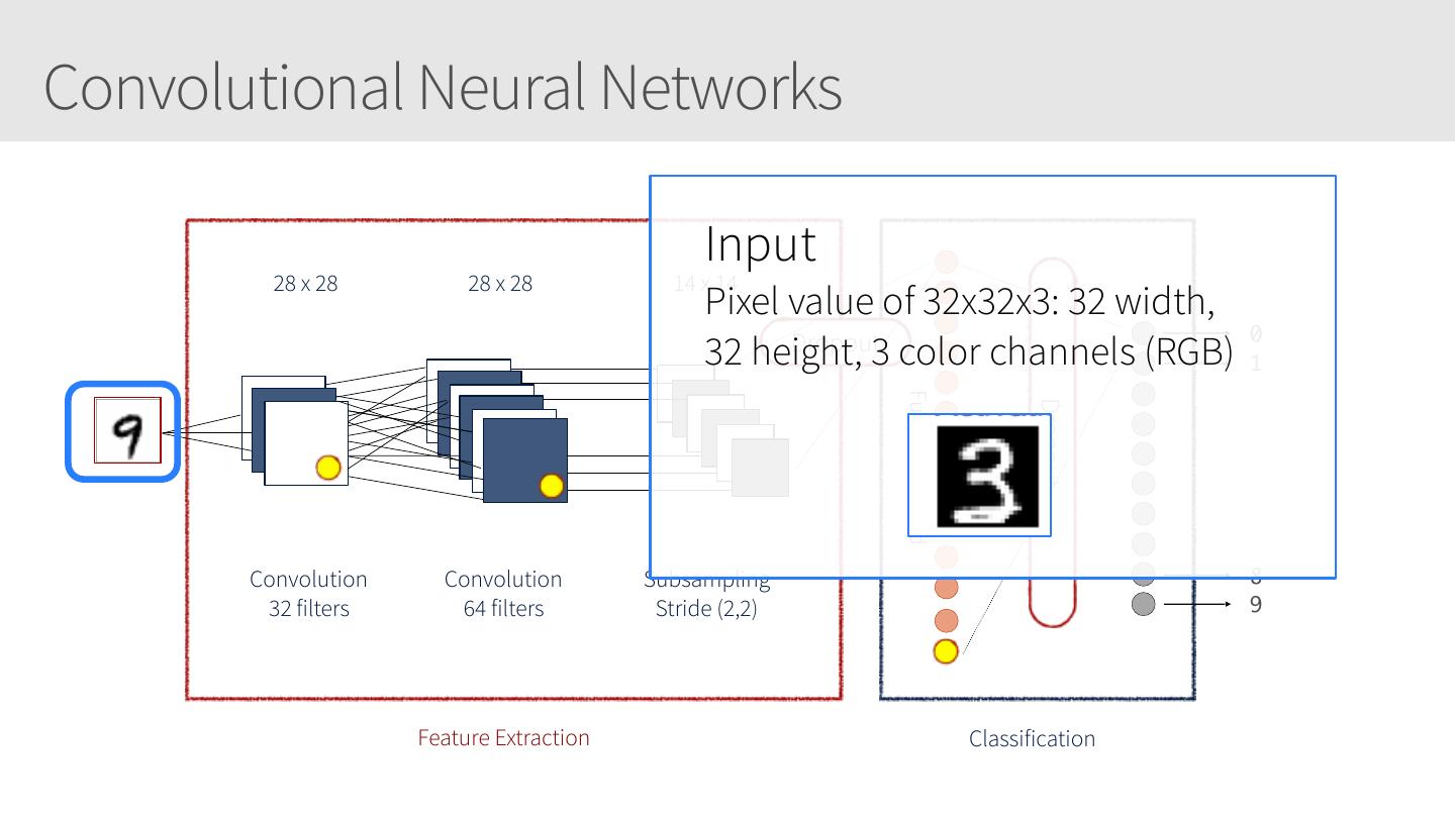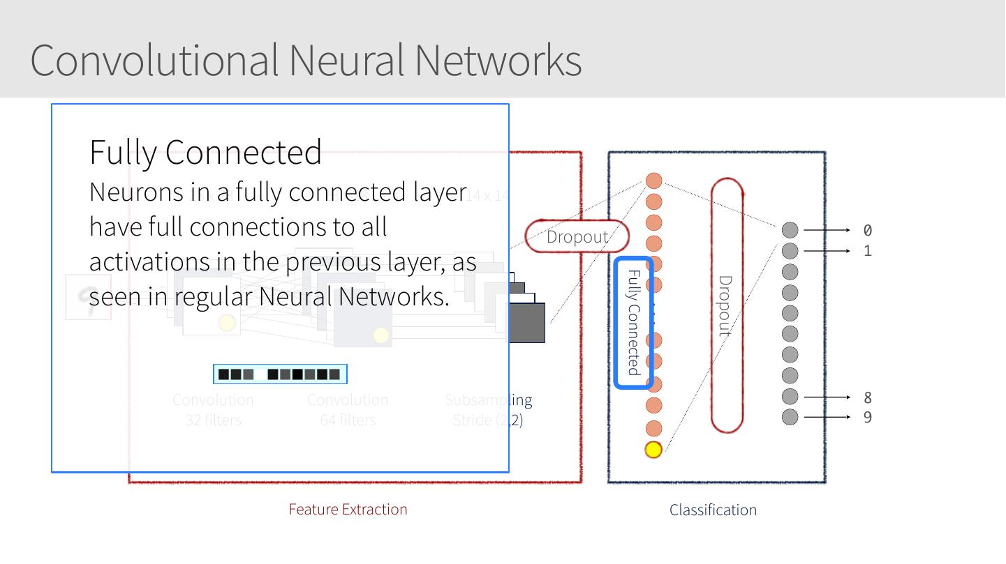 8 .Convolutional Neural Networks 28 x 28 28 x 28 14 x 14 0 Dropout 1 Fully Connected Dropout Convolution Convolution Subsampling 8 32 filters 64 filters Stride (2,2) 9 Feature Extraction Classification