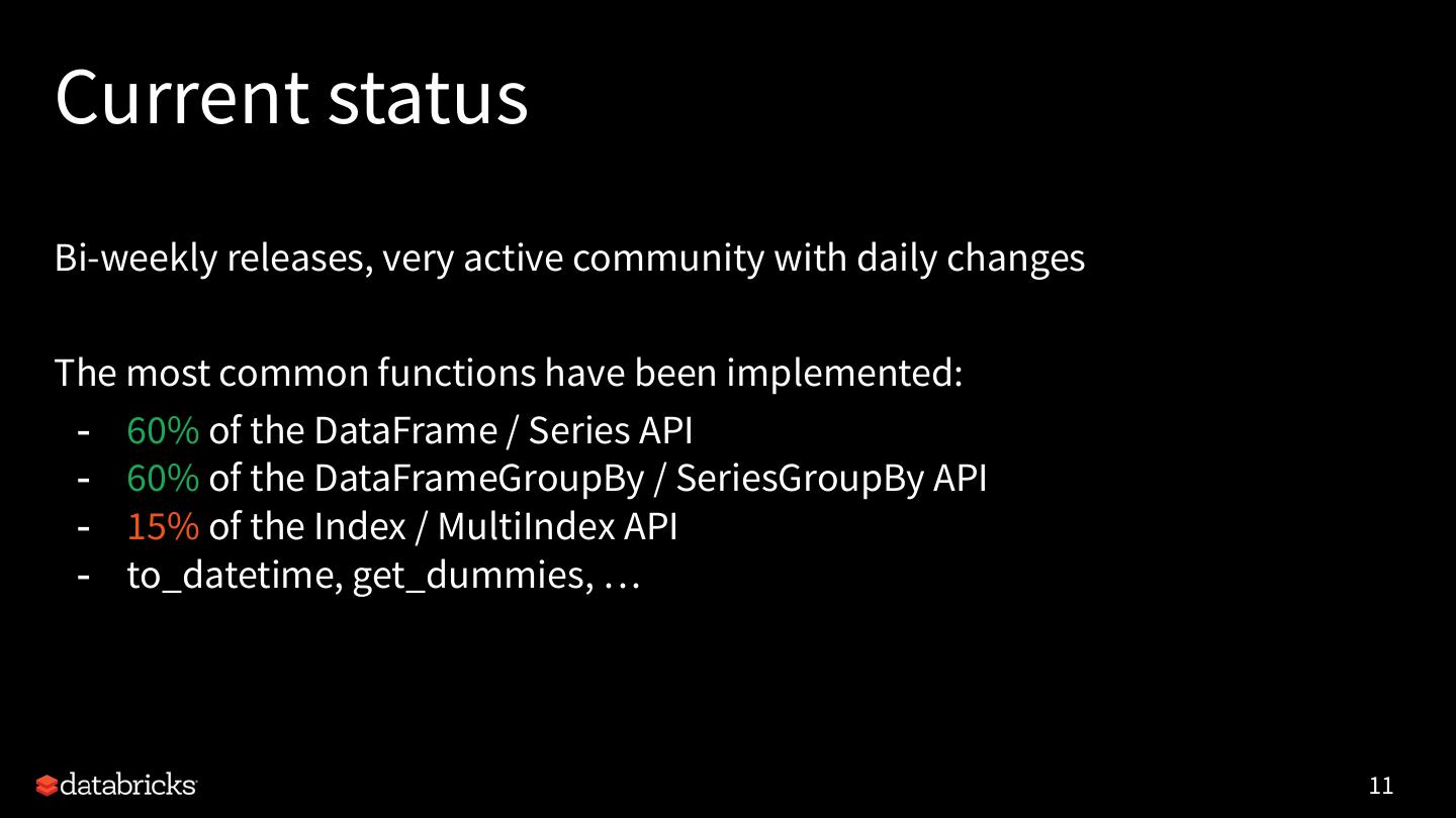 11 .Current status Bi-weekly releases, very active community with daily changes The most common functions have been implemented: - 60% of the DataFrame / Series API - 60% of the DataFrameGroupBy / SeriesGroupBy API - 15% of the Index / MultiIndex API - to_datetime, get_dummies, … 11
