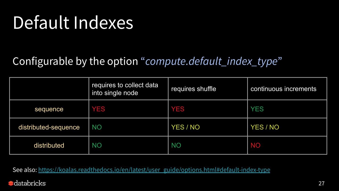 26 .Default Index Koalas manages a group of columns as index. The index behaves the same as pandas’. If no index is specified when creating a Koalas DataFrame: it attaches a “default index” automatically. Each “default index” has Pros and Cons. 26