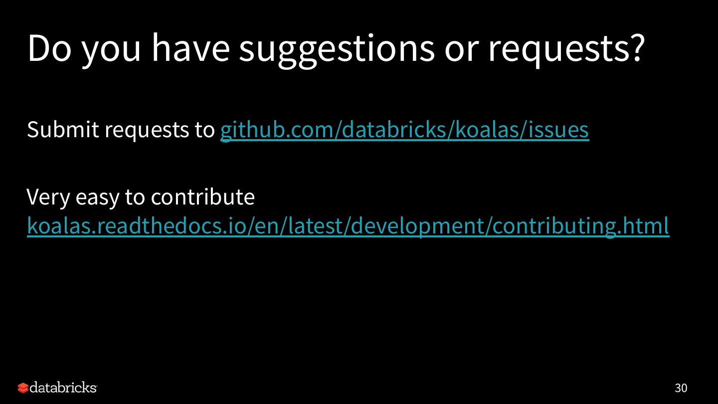 29 .Getting started pip install koalas conda install koalas Look for docs on https://koalas.readthedocs.io/en/latest/ and updates on github.com/databricks/koalas 10 min tutorial in a Live Jupyter notebook is available from the docs. 29