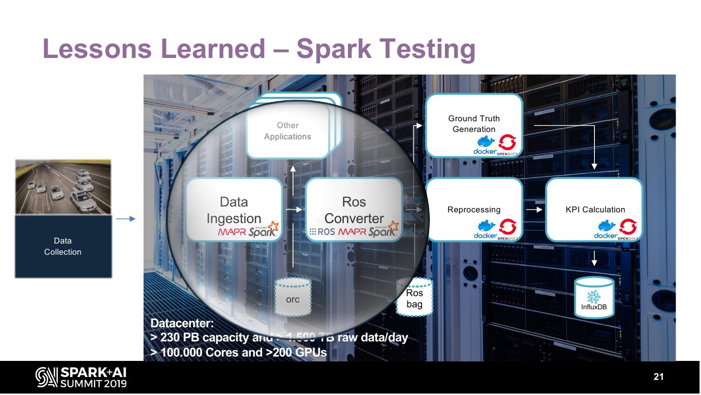 21 .Lessons Learned – Spark Testing Other Ground Truth Other Applications Other Generation Applications Applications Data Ros Reprocessing KPI Calculation Ingestion Converter Data Collection Ros orc bag InfluxDB Datacenter: > 230 PB capacity and > 1.500 TB raw data/day > 100.000 Cores and >200 GPUs 21