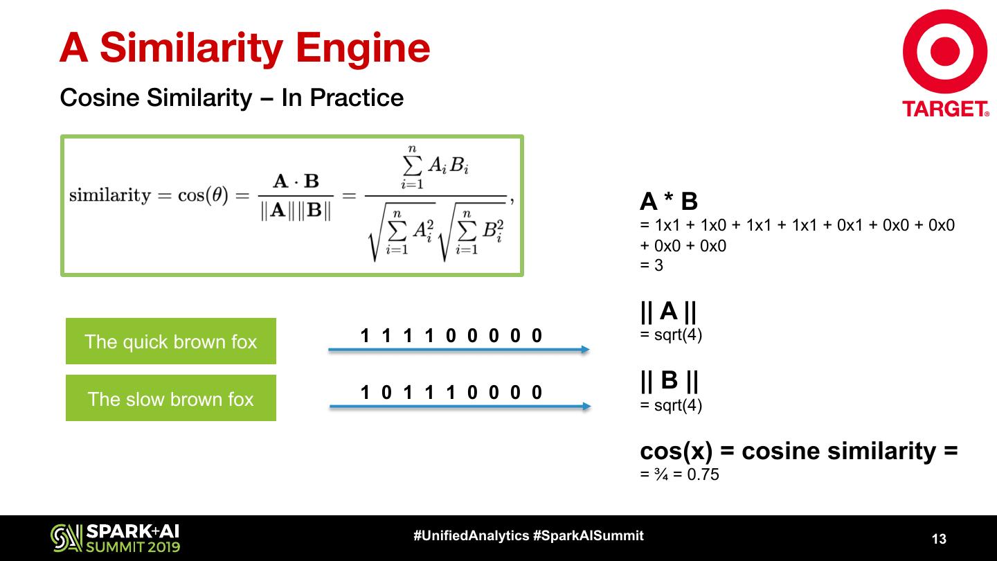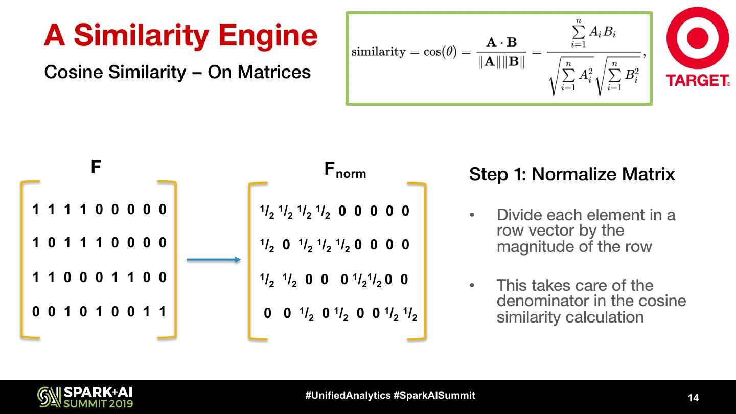 13 .A Similarity Engine Cosine Similarity – In Practice A*B = 1x1 + 1x0 + 1x1 + 1x1 + 0x1 + 0x0 + 0x0 + 0x0 + 0x0 =3 || A || The quick brown fox 1 1 1 1 0 0 0 0 0 = sqrt(4) 1 0 1 1 1 0 0 0 0 || B || The slow brown fox = sqrt(4) cos(x) = cosine similarity = = ¾ = 0.75 #UnifiedAnalytics #SparkAISummit 13