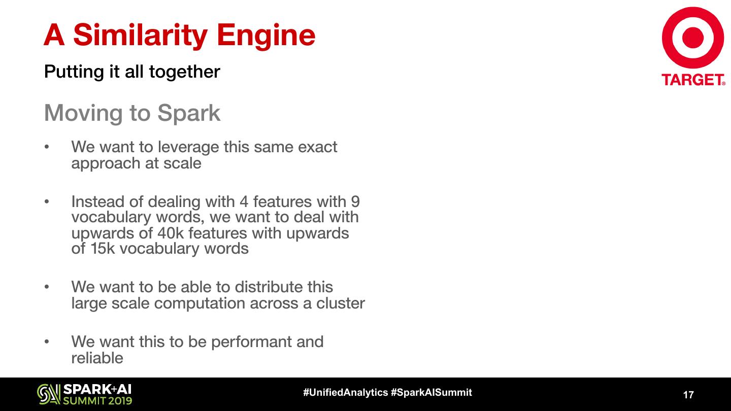 17 .A Similarity Engine Putting it all together Moving to Spark • We want to leverage this same exact approach at scale • Instead of dealing with 4 features with 9 vocabulary words, we want to deal with upwards of 40k features with upwards of 15k vocabulary words • We want to be able to distribute this large scale computation across a cluster • We want this to be performant and reliable #UnifiedAnalytics #SparkAISummit 17