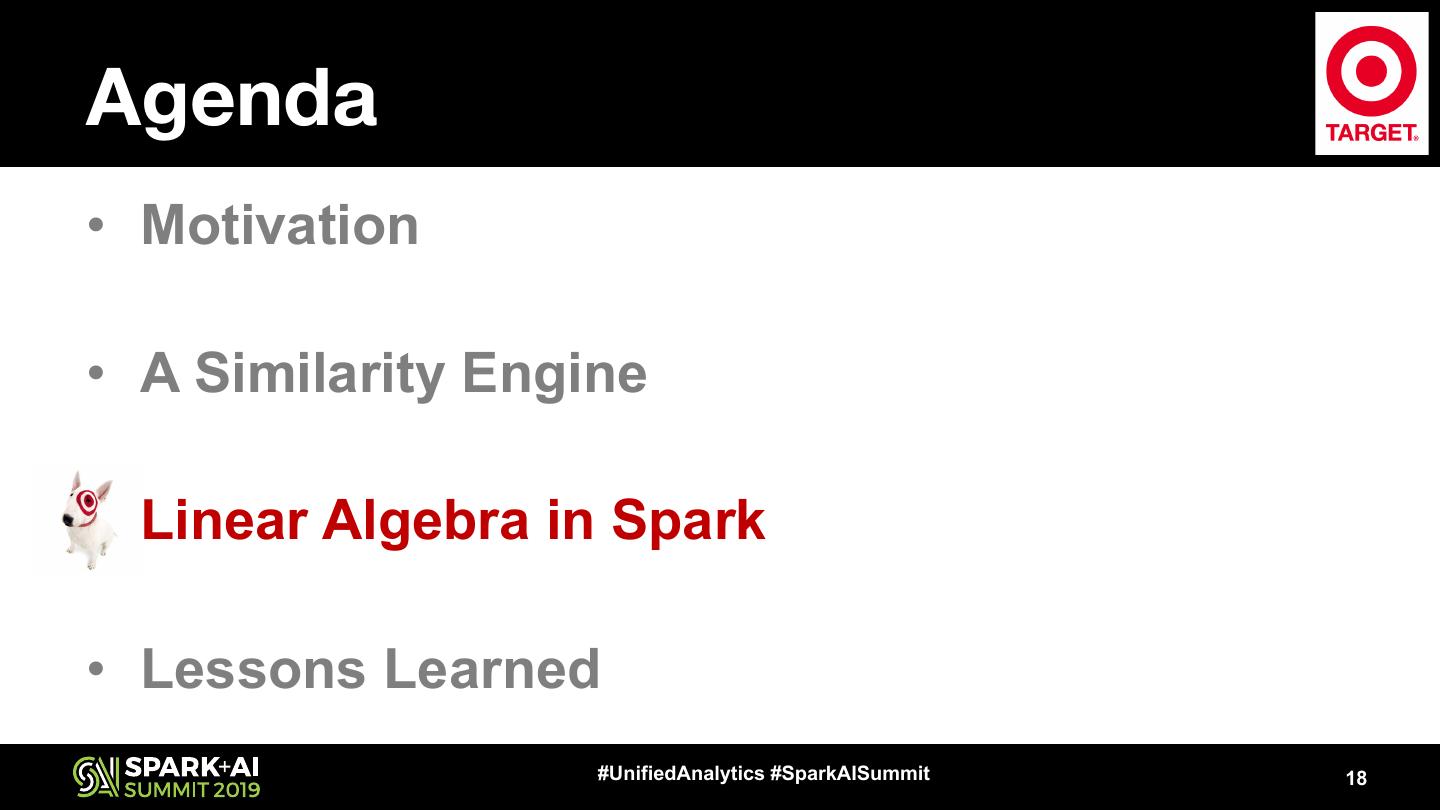 18 .Agenda • Motivation • A Similarity Engine • Linear Algebra in Spark • Lessons Learned #UnifiedAnalytics #SparkAISummit 18