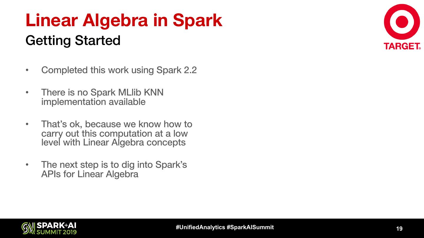 19 .Linear Algebra in Spark Getting Started • Completed this work using Spark 2.2 • There is no Spark MLlib KNN implementation available • That’s ok, because we know how to carry out this computation at a low level with Linear Algebra concepts • The next step is to dig into Spark’s APIs for Linear Algebra #UnifiedAnalytics #SparkAISummit 19